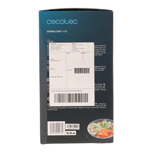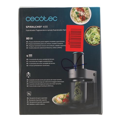 The Cecotec Spiralchef 400 Spiralizer is a powerful 80W kitchen tool equipped with 4 stainless steel blades of different sizes for spiral cutting fruits and vegetables. With a wide feeding chute, this spiralizer makes it easy to create healthy and delicious meals in minutes. Say goodbye to boring salads and hello to beautifully spiralized dishes with this convenient and versatile kitchen gadget.