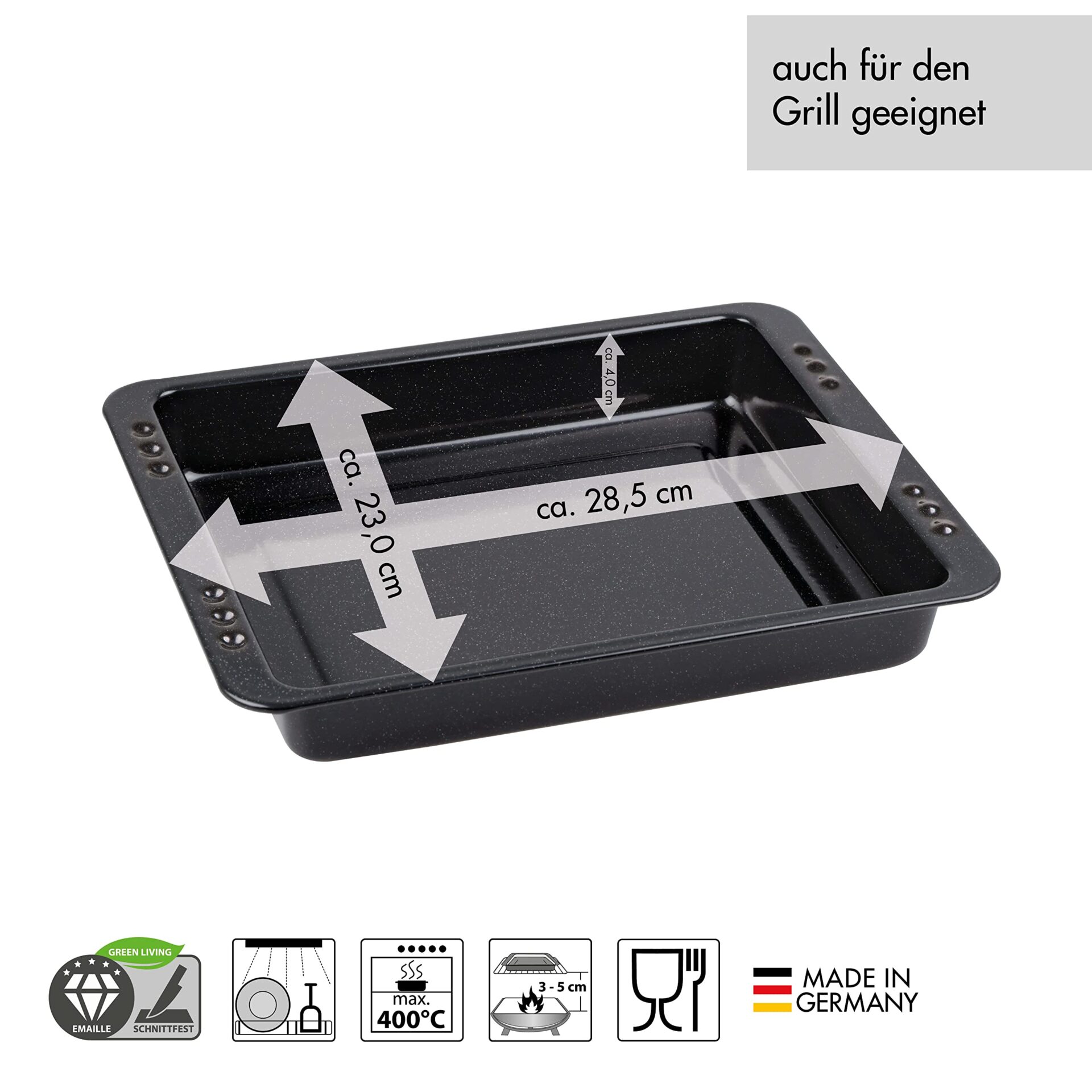 Chg 3394-52 to forma do pieczenia o wyjątkowych właściwościach, które sprawią, że Twoje potrawy będą smakować jeszcze lepiej. Wykonana z wysokiej jakości emalii w kolorze czarnym, forma ta ma wymiary około 285 x 23 x 4 cm, co sprawia, że jest idealna do pieczenia różnorodnych potraw.