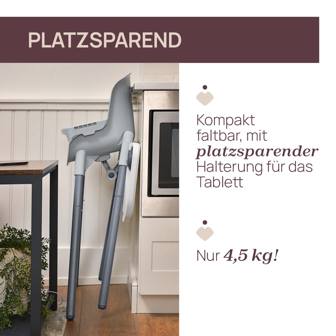 ✅ KOMPAKTOWE PO ZŁOŻENIU: KOMPAKTOWE PO ZŁOŻENIU I Z MIEJSCEM DO ZAWIESZENIA TACKI: Gdy nie jest używana, krzesełko można złożyć do kompaktowych rozmiarów a tackę można zawiesić na tylnych nogach.