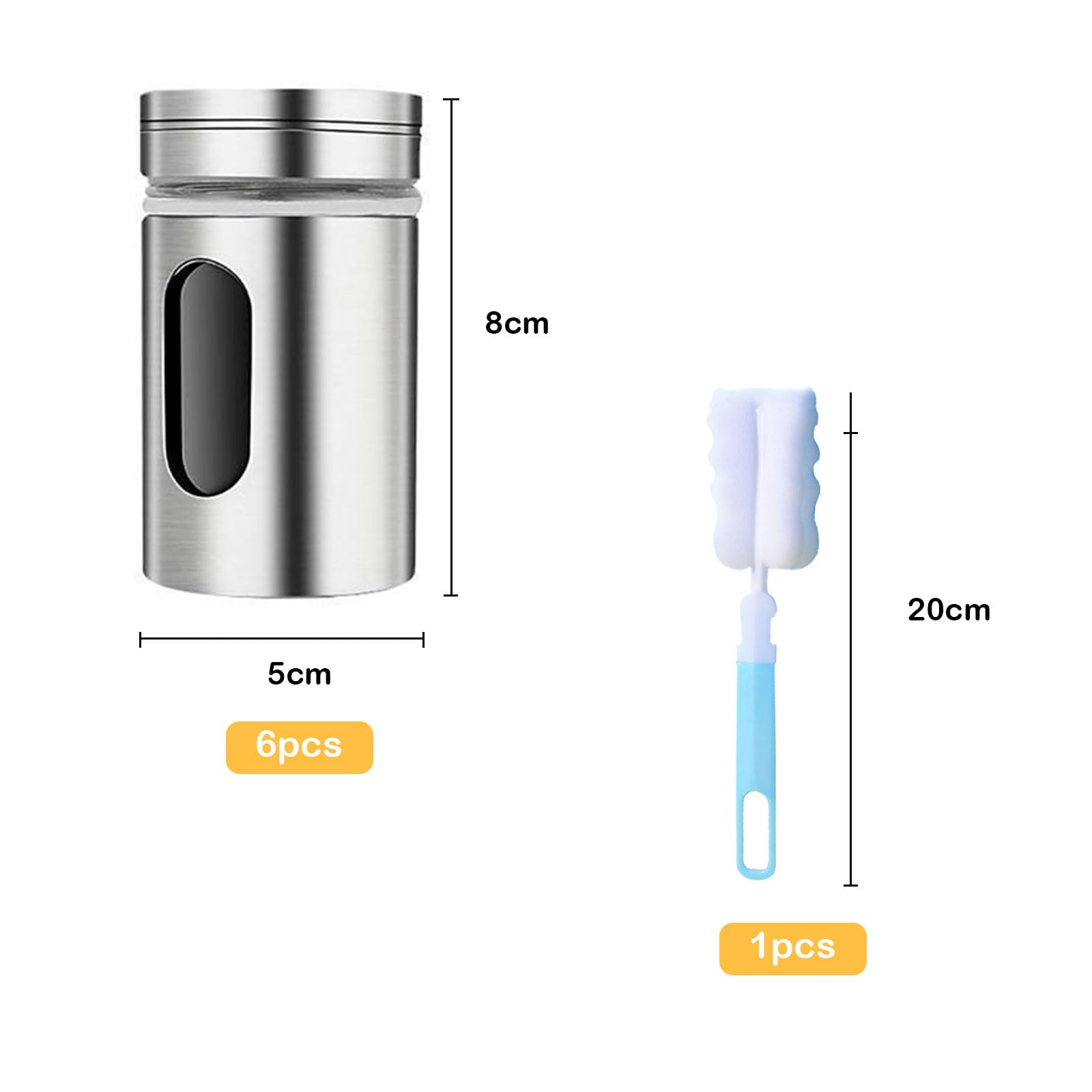 Pojemniki na przyprawa, 6 sztuk słoiczków z wkładem do posypywania, okrągłe, ze stali nierdzewnej, zestaw z 1 szczotką gąbkową