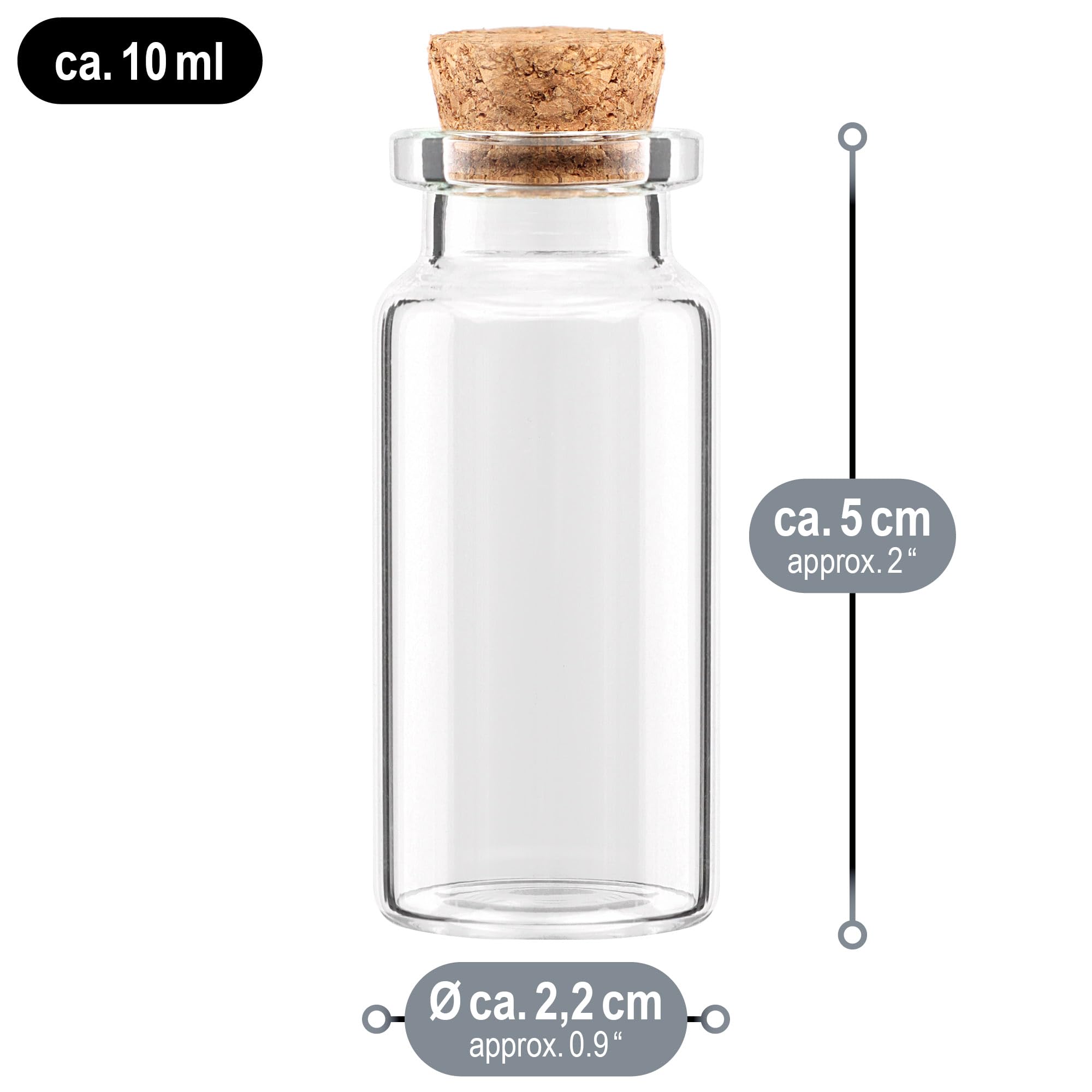 ✅ ZAKRES DOSTAWY: 60x: ZAKRES DOSTAWY: 60x butelki po 10 ml kazda // Material: szklo, korek (naturalny) // Wymiary: Butelka ok. 50 x 22 mm, korek ok. 10 x 13 mm (wysokosc x R) // Objetosc na butelke: ok. 10 ml