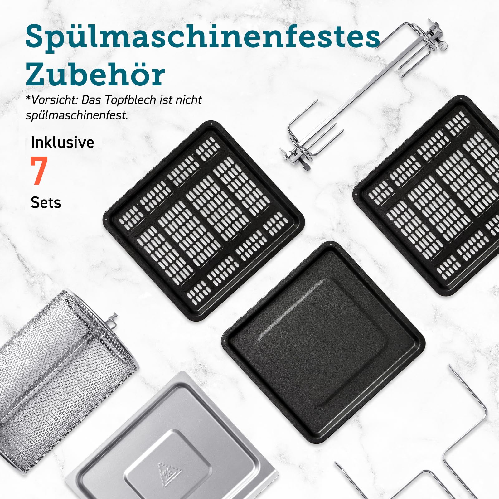 COSORI wyposażyło frytkownicę w 7 akcesoriów z powłoką nieprzywierającą, które można myć w zmywarce i są wolne od BPA. W zestawie znajdziesz blachę do pieczenia, dwa wskaźniki frytkowników, tackę do odwadniania, koszyk do grillowania oraz zestaw do grillowania. Dodatkowo, 30-stronicowa książka z przepisami stworzona przez profesjonalnych kucharzy zaprasza do odkrywania nowych smaków. Możesz także korzystać z aplikacji VeSync, aby odkrywać kolejne kreatywne przepisy.
