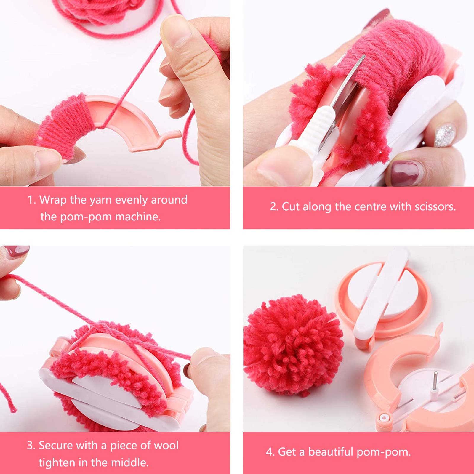 Jednym z kluczowych elementów zestawu jest także nożyczki, które są odpowiednie zarówno dla dzieci, jak i dorosłych. Dzięki nim łatwo i precyzyjnie można przyciąć wełnę i uformować idealny kształt pomponu. Zestaw jest łatwy w użyciu i idealny zarówno dla początkujących, jak i doświadczonych twórców.
