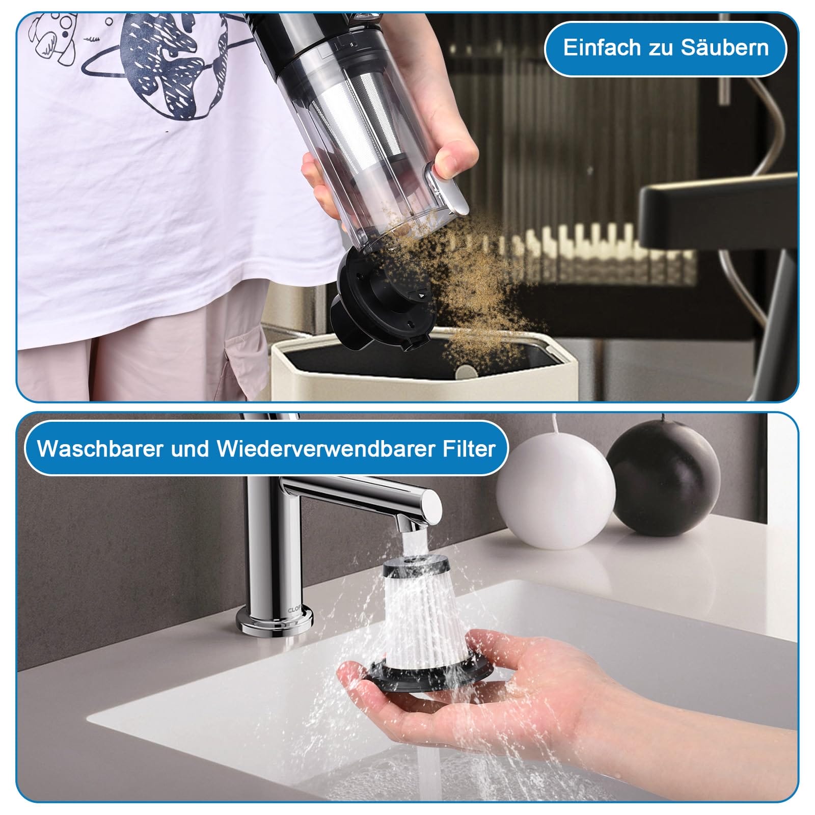 4. Filtr zmywalny i dioda LED: Odkurzacz ręczny jest wyposażony w wymienny, zmywalny i wielokrotnego użytku filtr HEPA, który jest bardziej trwały niż tradycyjne filtry. Dioda LED na odkurzaczu samochodowym zapewnia widoczność pracy nawet w warunkach słabego oświetlenia lub podczas pracy w samochodzie. Nie musisz już martwić się o czyszczenie w ciemnych zakamarkach lub w nocy.