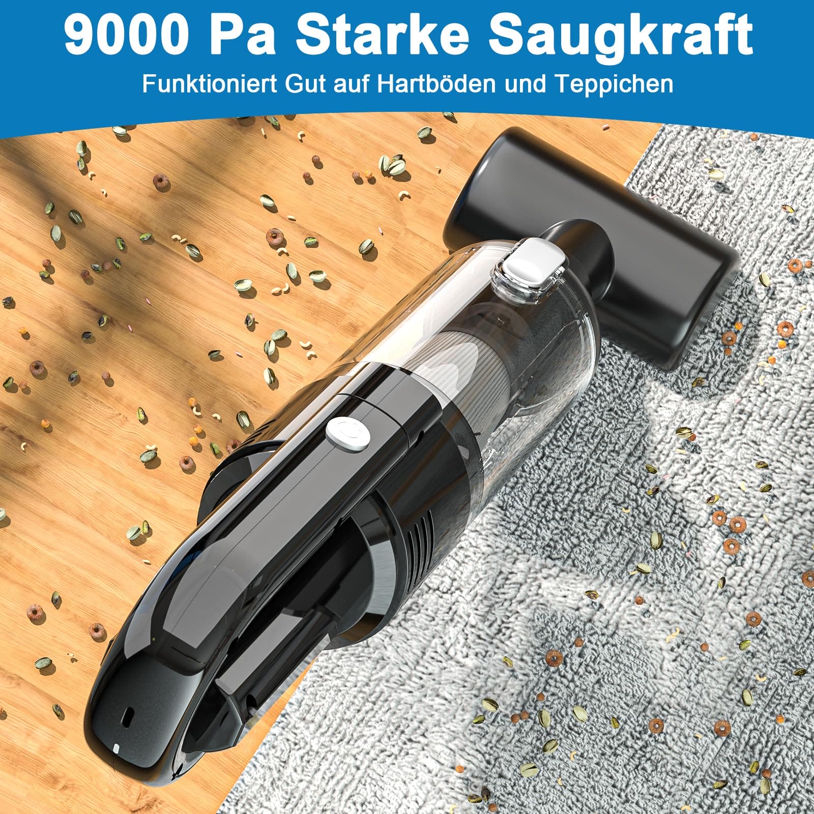 1. 9000 PA moc ssania: Ten odkurzacz ręczny zapewnia silne ssanie o wartości do 9000 PA, co umożliwia skuteczne usuwanie kurzu, sierści zwierząt oraz drobnych zanieczyszczeń, takich jak małe ziarna. Dodatkowo, minimalizuje hałas podczas pracy, co sprawia, że sprzątanie staje się przyjemniejsze.