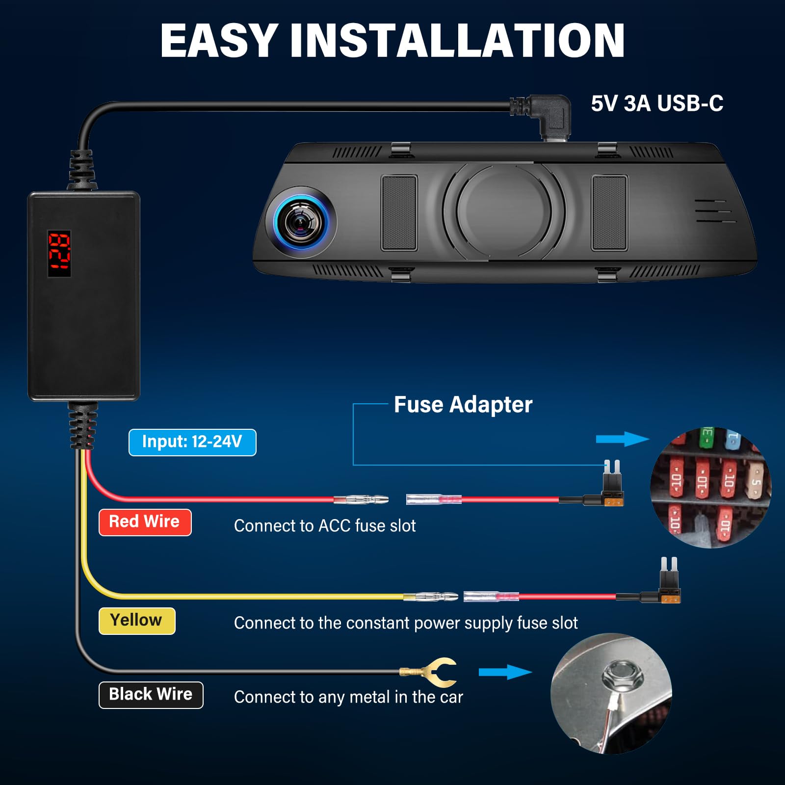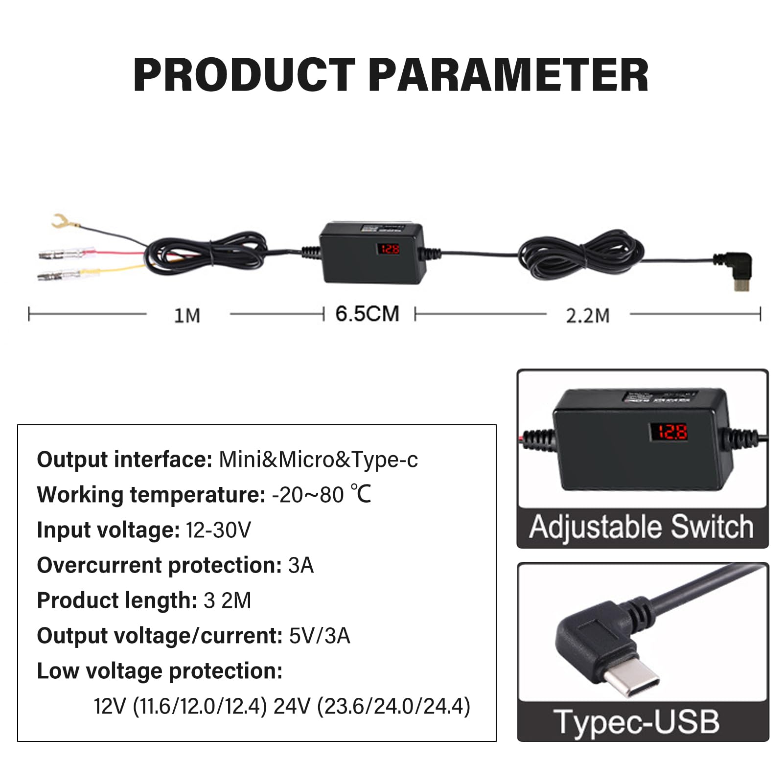 ➤➤ 【Szeroka pojemność】Zestaw: ➤➤ 【Szeroka pojemność】Zestaw do kamer samochodowych nadaje się do kamer samochodowych lub innych urządzeń zasilanych przez złącze typu C. Dash Cam Hardwire Kit maks. 5 V/3 A stałe napięcie wyjściowe, zestaw Dash Cam Hardwire Kit obsługuje napięcia wejściowe od 12 V do 24 V.