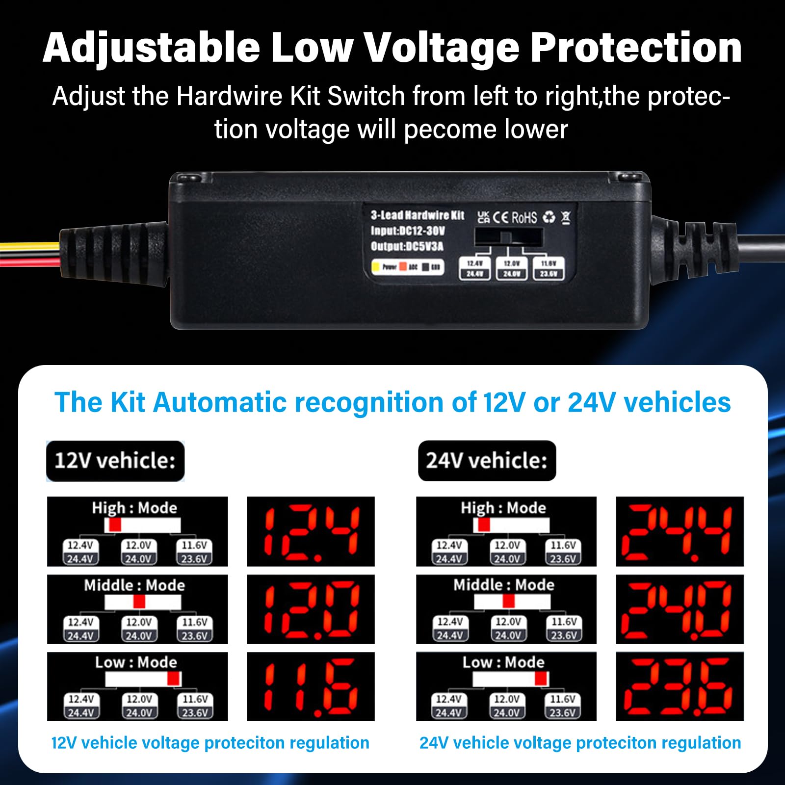 ➤➤ 【Ochrona niskiego: ➤➤ 【Ochrona niskiego napięcia】Zestaw do montażu na desce rozdzielczej z automatycznym wykrywaniem baterii i funkcją ochrony przed niskim napięciem. Dash Cam Hardwire Kit Przy napięciu poniżej 11,6 V lub 23,6 V wyjście prądu zostanie automatycznie wyłączone. Hardwire Kit Dash Cam kompatybilny z pojaz