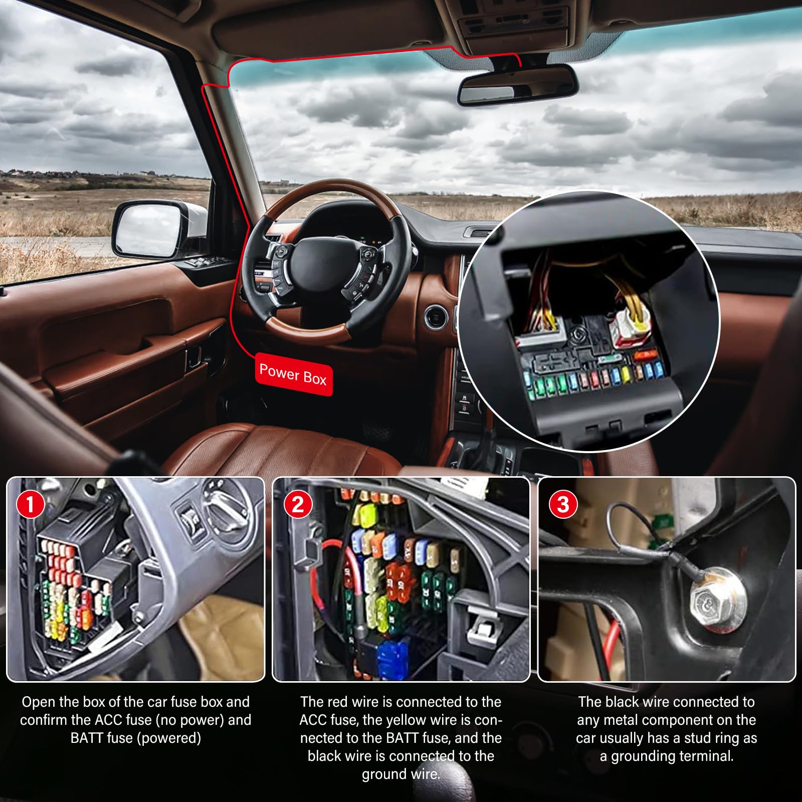 ➤➤ 【Łatwa instalacja】Otwórz: ➤➤ 【Łatwa instalacja】Otwórz skrzynkę bezpieczników Hardwire Kit Dash Cam; znajdź i podłącz odpowiedni bezpiecznik; podłącz zapasowy adapter do kamery samochodowej Hardwire Kit.