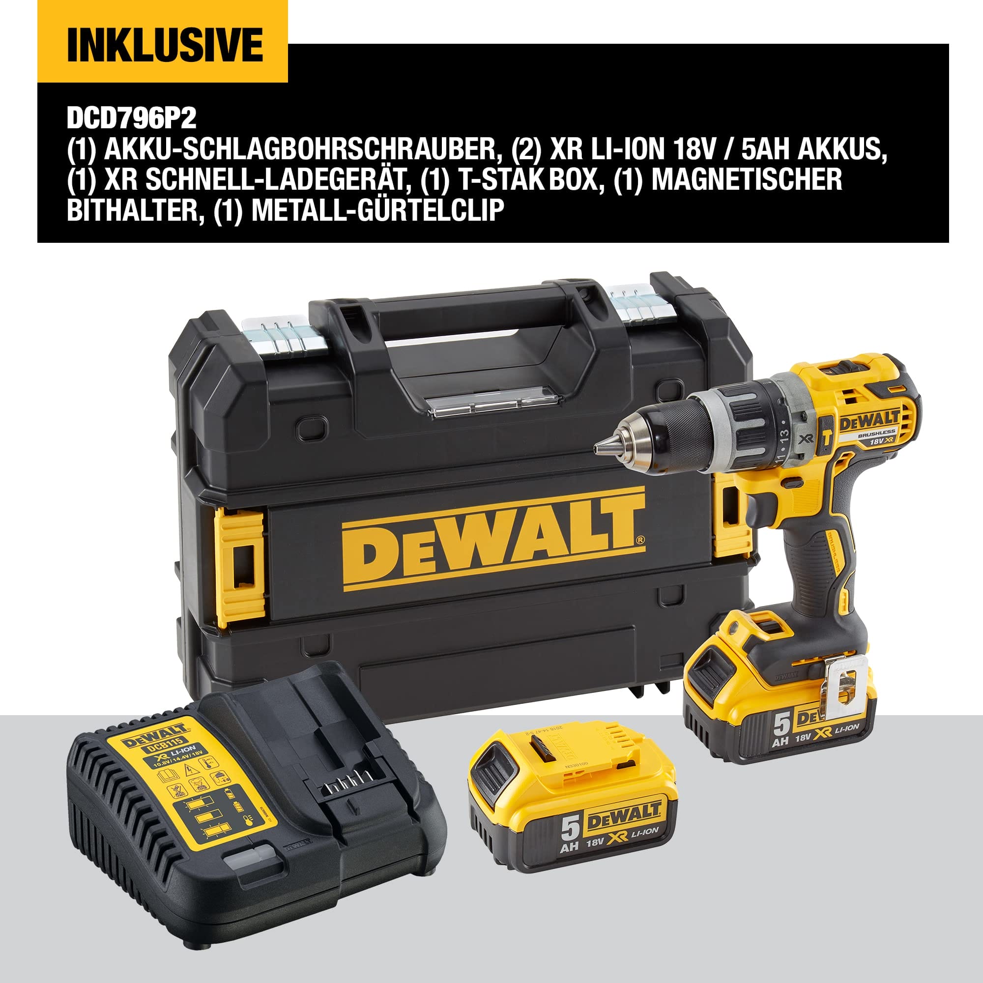 DEWALT, Wiertarko-wkrętarka udarowa 18V XR w zestawie z dwoma akumulatorami 5.0 Ah, DCD796P2