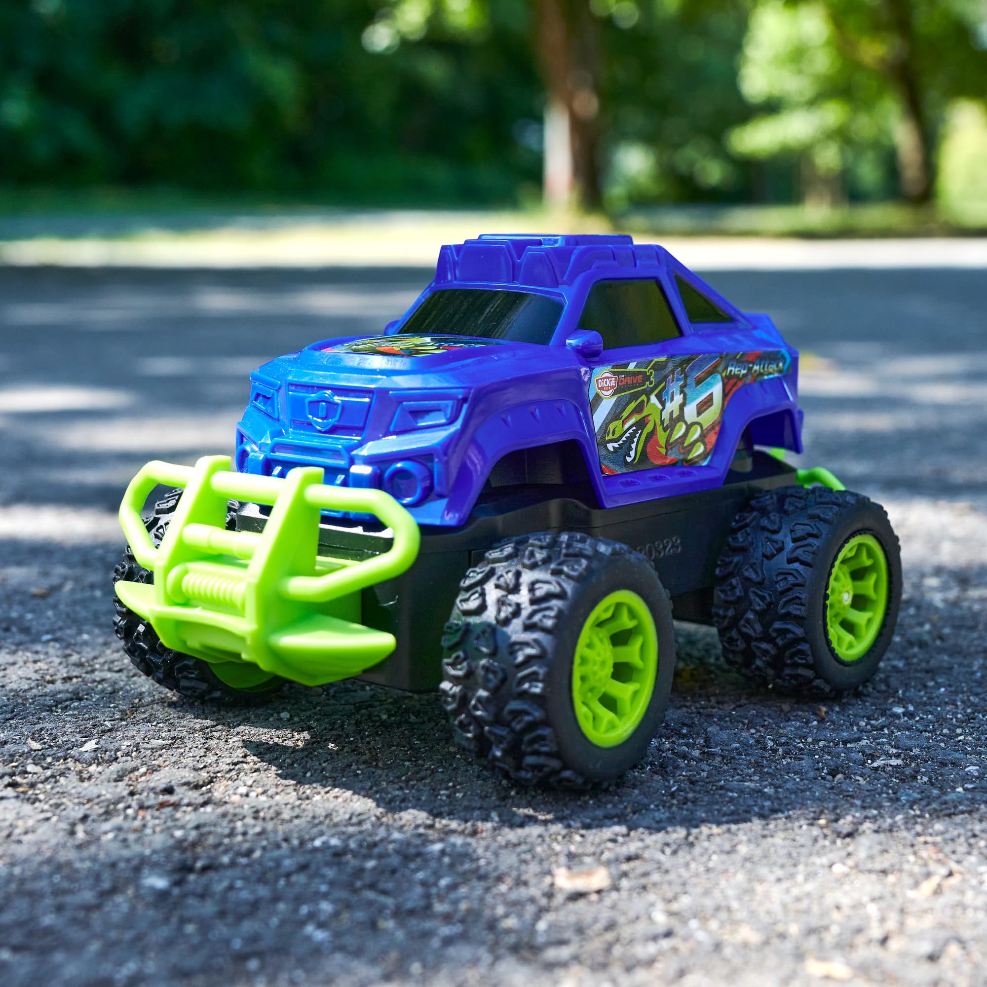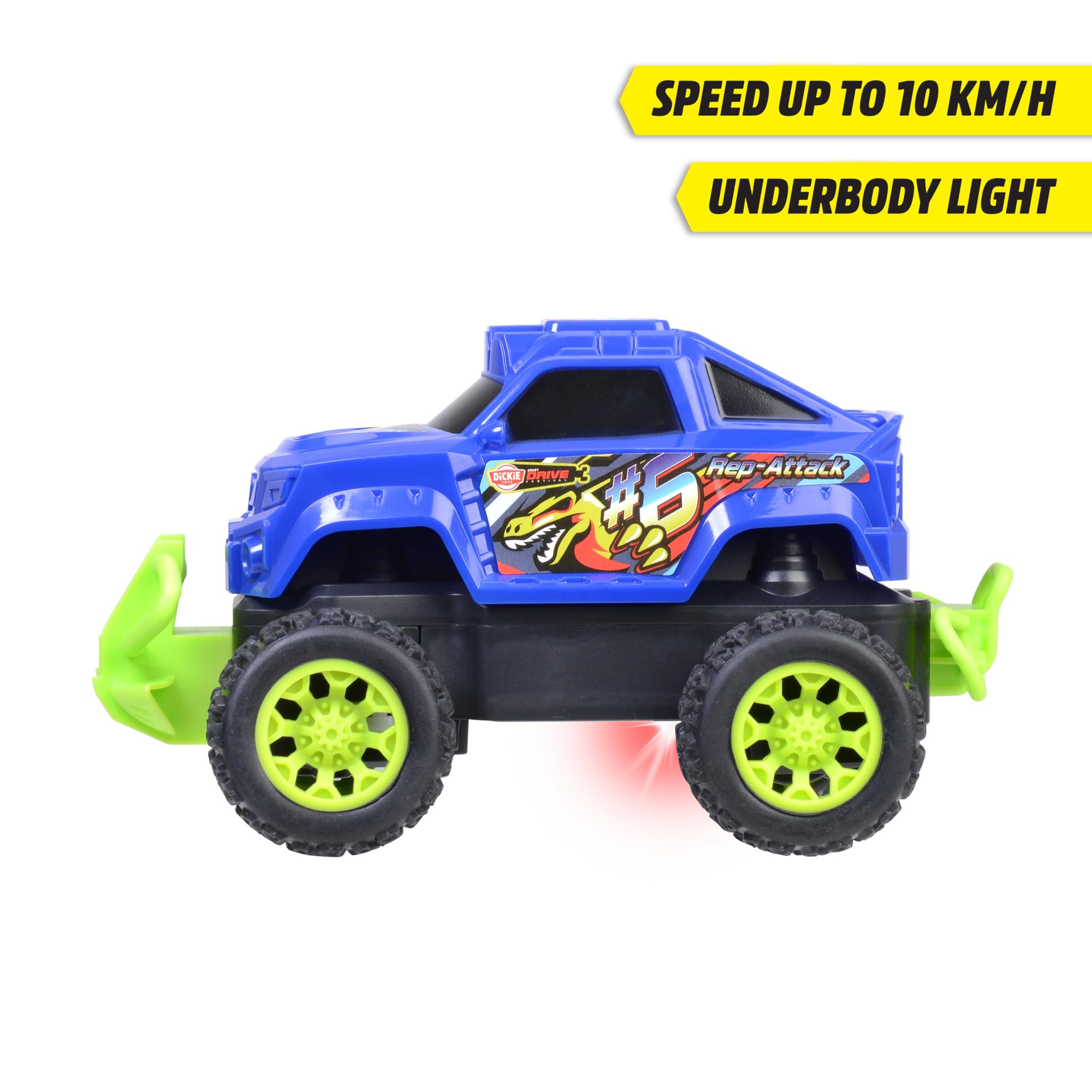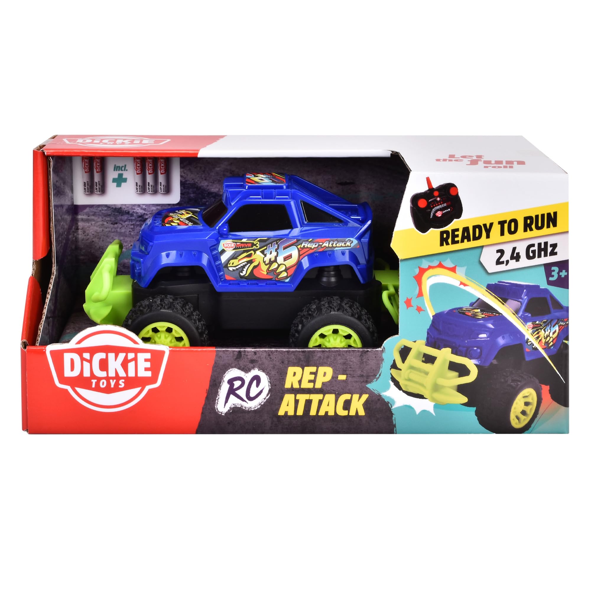 Ferngesteuerter Monstertruck: Kinderspielzeug ab 6 Jahre Mit dem RC Truck „Rep Attack” von Dickie Toys startet das Auto-Abenteuer für Kinder ab 6 Jahren! Dank seiner überdimensionalen Profilreifen bewegt sich das ferngesteuerte Spielzeugauto mühelos übers Gelände. Wie gut, dass der Mini Monstertruck mit einem breiten Rammschutz an der Vorderseite ausgestattet ist, denn der bunte Flitzer erreicht Geschwindigkeiten von bis zu 10 km/h! Auto mit Fernsteuerung für Indoor & Outdoor Die kinderleichte Kontrolle des Autos per 2-Kanal-FS-Funksteuerung gelingt bereits den Kleinsten und lässt das Fahrzeug in sämtliche Richtungen fahren, ob vorwärts, rückwärts, links oder rechts. Durch die stabile Signalübertragung auf einer Frequenz von 2,4 GHz können bis zu 16 Fahrzeuge gleichzeitig gesteuert werden, ohne dass es zu Interferenzen oder Signalstörungen kommt. Wird das RC Auto 5 Minuten lang nicht bewegt, schaltet es sich automatisch in den Schlafmodus, um die Batterien (enthalten) zu schonen. Produktdetails: • Länge des Autos: 15,5 cm • bis zu 10 km/h • Fernsteuerung: 2-Kanal FS, 2,4 GHz für bis zu 16 Fahrzeuge gleichzeitig • Batterien: 2x 1,5V R03 für Sender und 3x 1,5V LR6 (Alkaline) für Fahrzeug • Lieferumfang: Auto mit Fernbedienung und 5 Batterien • Spielzeug für Kinder ab 6 Jahren Ein Qualitäts-Spielzeug von Dickie Toys Als Unternehmen mit über 50 Jahren Branchenerfahrung wissen wir, wie wir Kinder verschiedenster Altersgruppen begeistern und zum Spielen animieren. Schon die Kleinsten beginnen sehr früh damit die zahlreichen Spielfunktionen zu entdecken und zu testen. Dickie Toys schult so die motorischen Fähigkeiten und geht zudem erste Schritte in Richtung Verkehrserziehung. Ob im Kinderzimmer oder draußen im Freien, mit Dickie Toys ist der Spielspaß absolut garantiert.