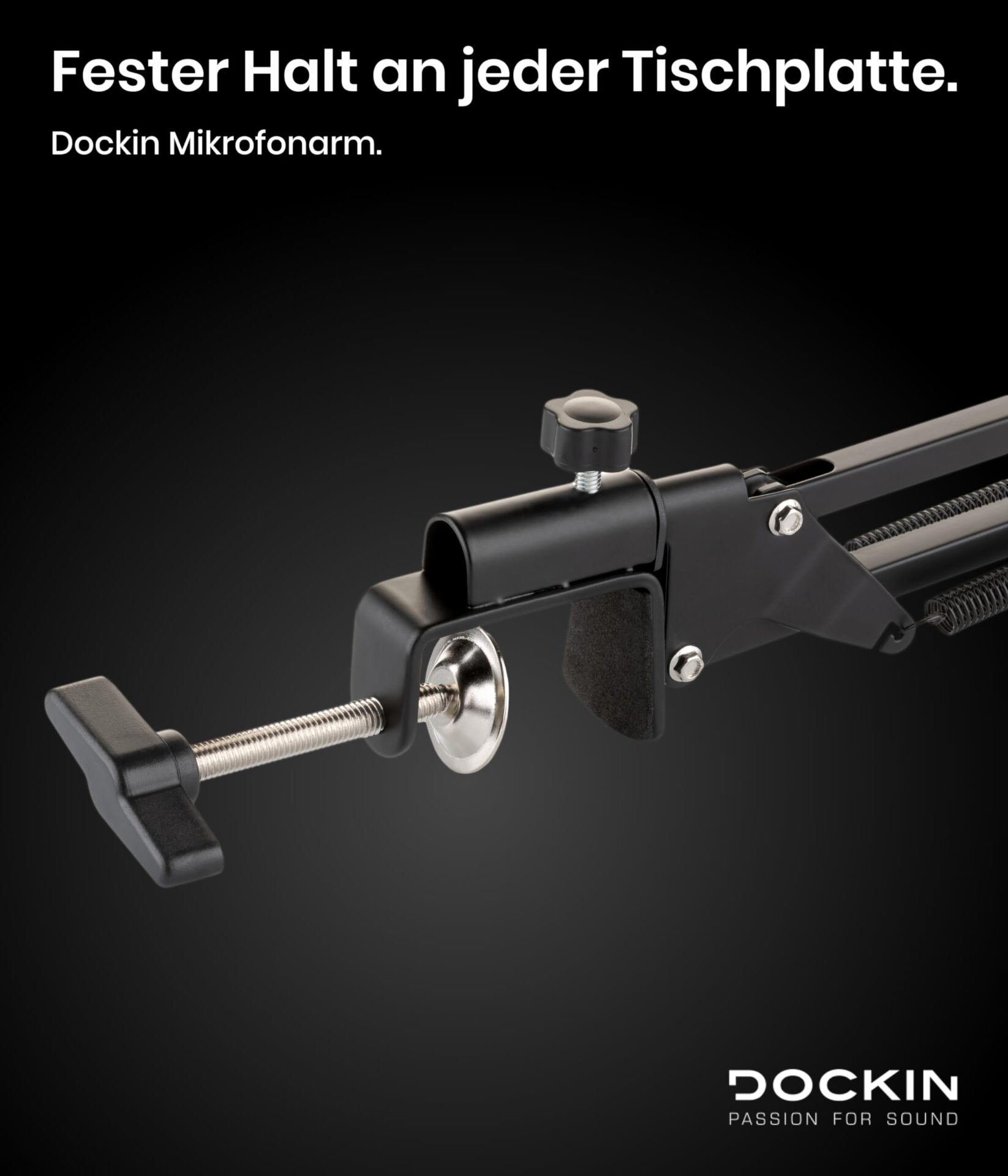 • UWAGA: Zakres dostawy obejmuje ramię wysięgnika DOCKIN MA100 wraz z zaciskiem stołowym. Mikrofon i pop-filtr nie wchodzą w skład zestawu.