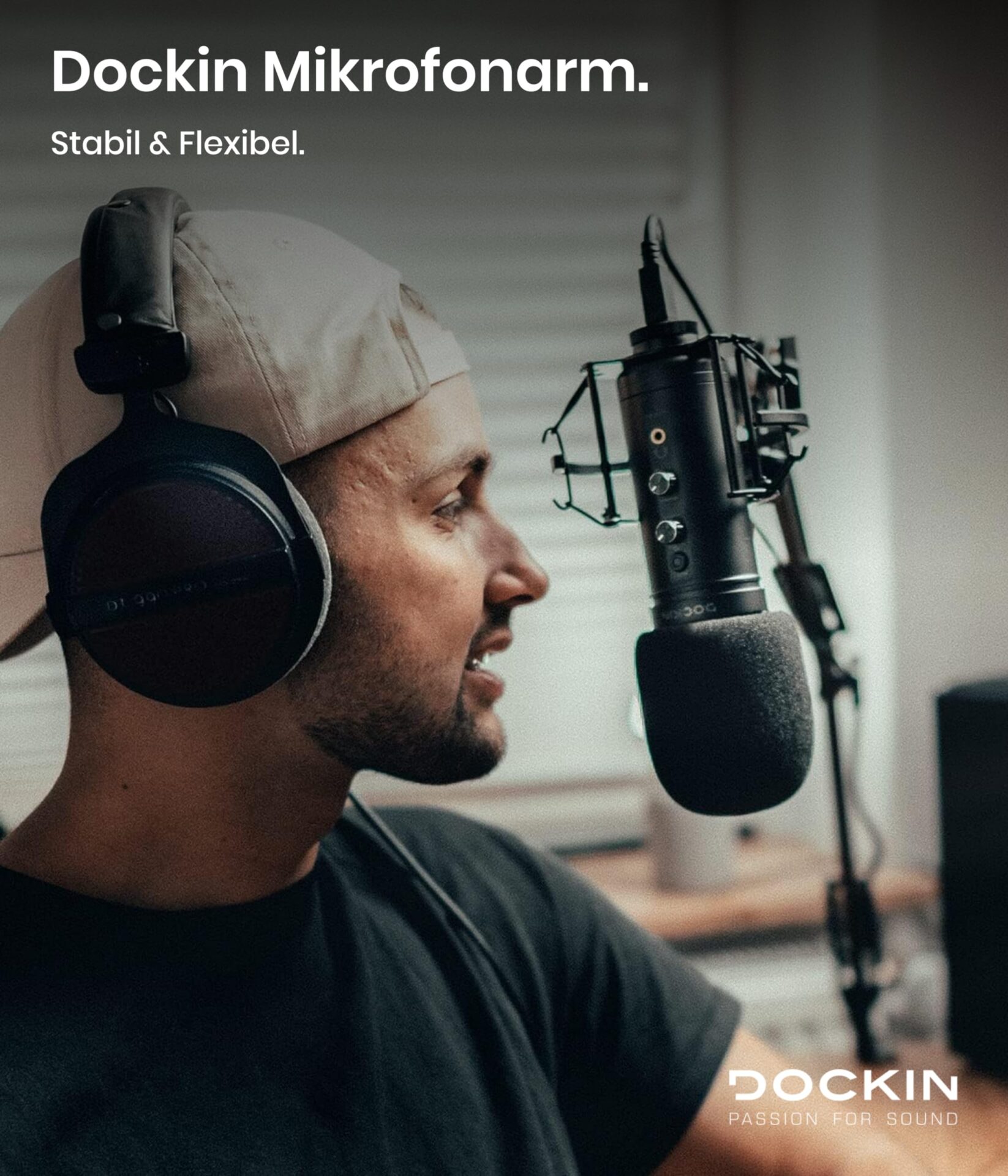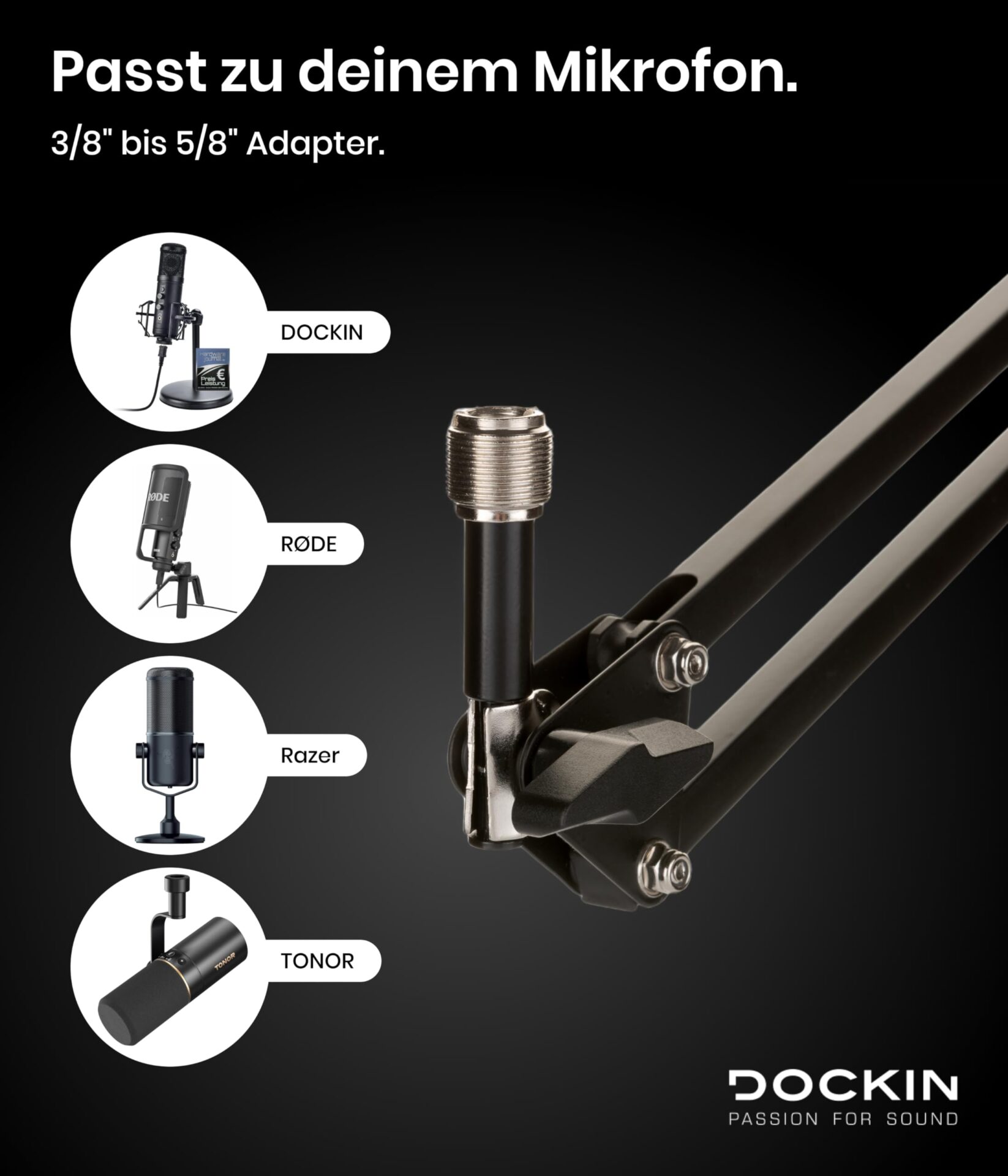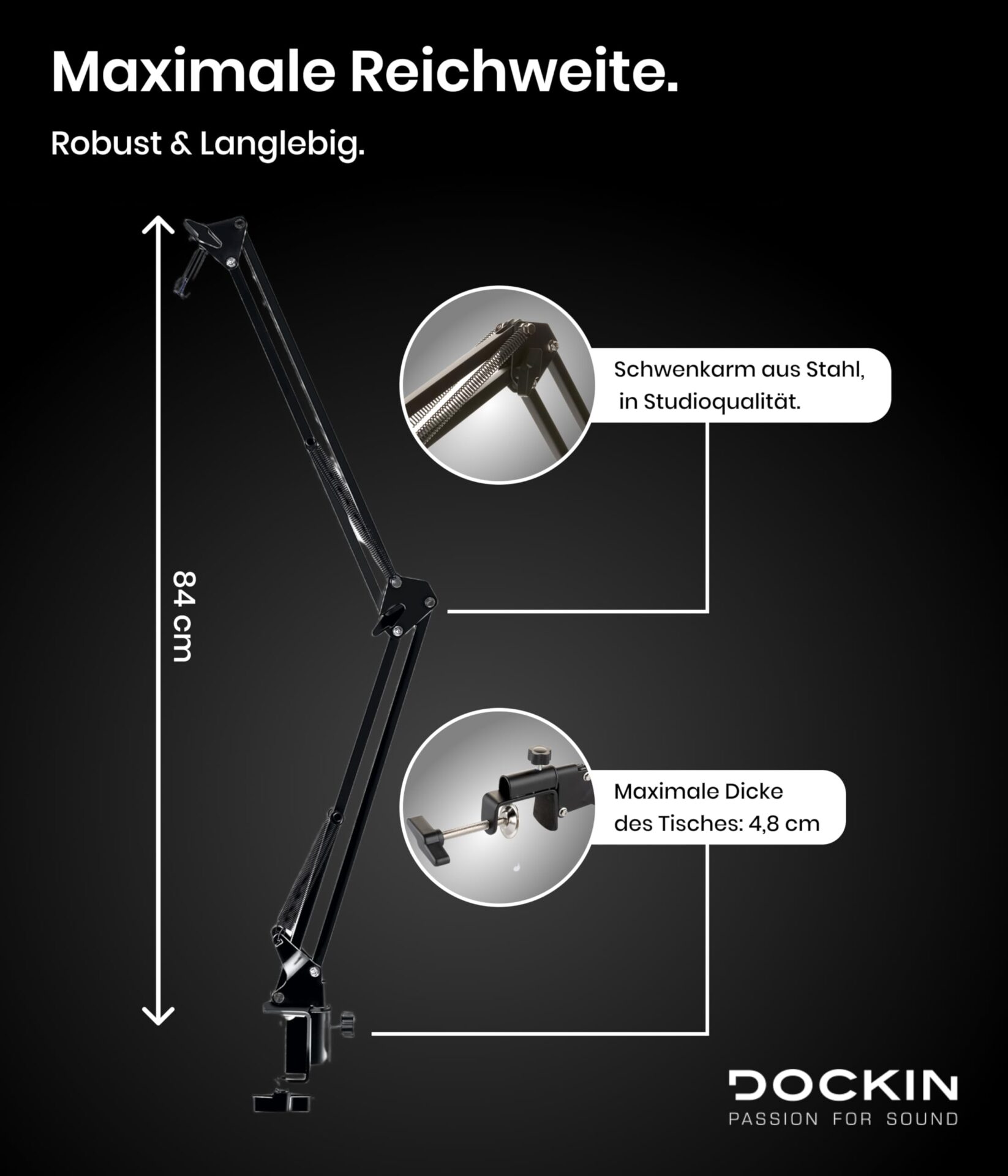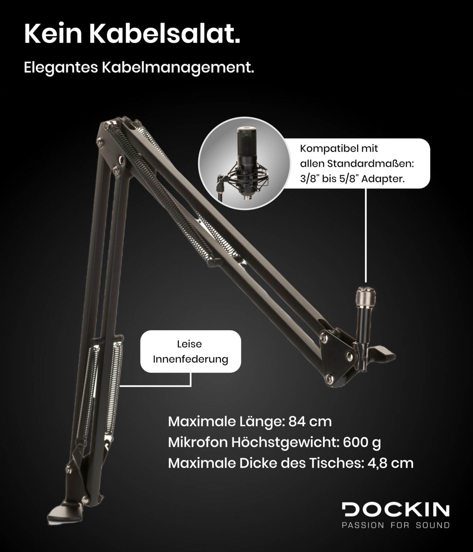 • Wszechstronny uchwyt na mikrofon: Dzięki zasięgowi 84 cm (adapter 3/8″ na 5/8″) i bardzo szerokiemu kątowi obrotu ramienia obrotowego, mikrofon można stabilnie umieścić wszędzie tam, gdzie jest potrzebny. Wysięgnik mikrofonowy jest przeznaczony do mikrofonów podcastowych DOCKIN MP2000 i MP1000, ale statyw może być również używany do innych mikrofonów studyjnych.