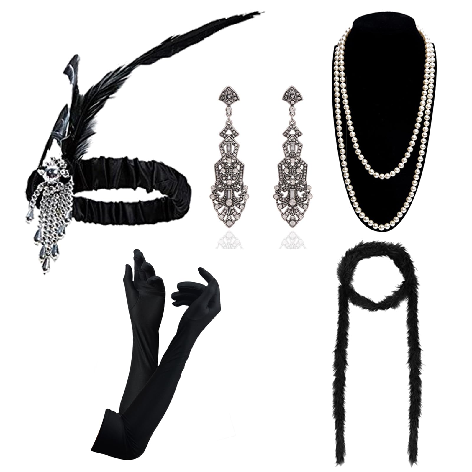 Zestaw akcesoriów DRESHOW 1920s dla kobiet – Opaska, Naszyjnik, Rękawiczki, Klapa Kostium – Styl retro i elegancja!