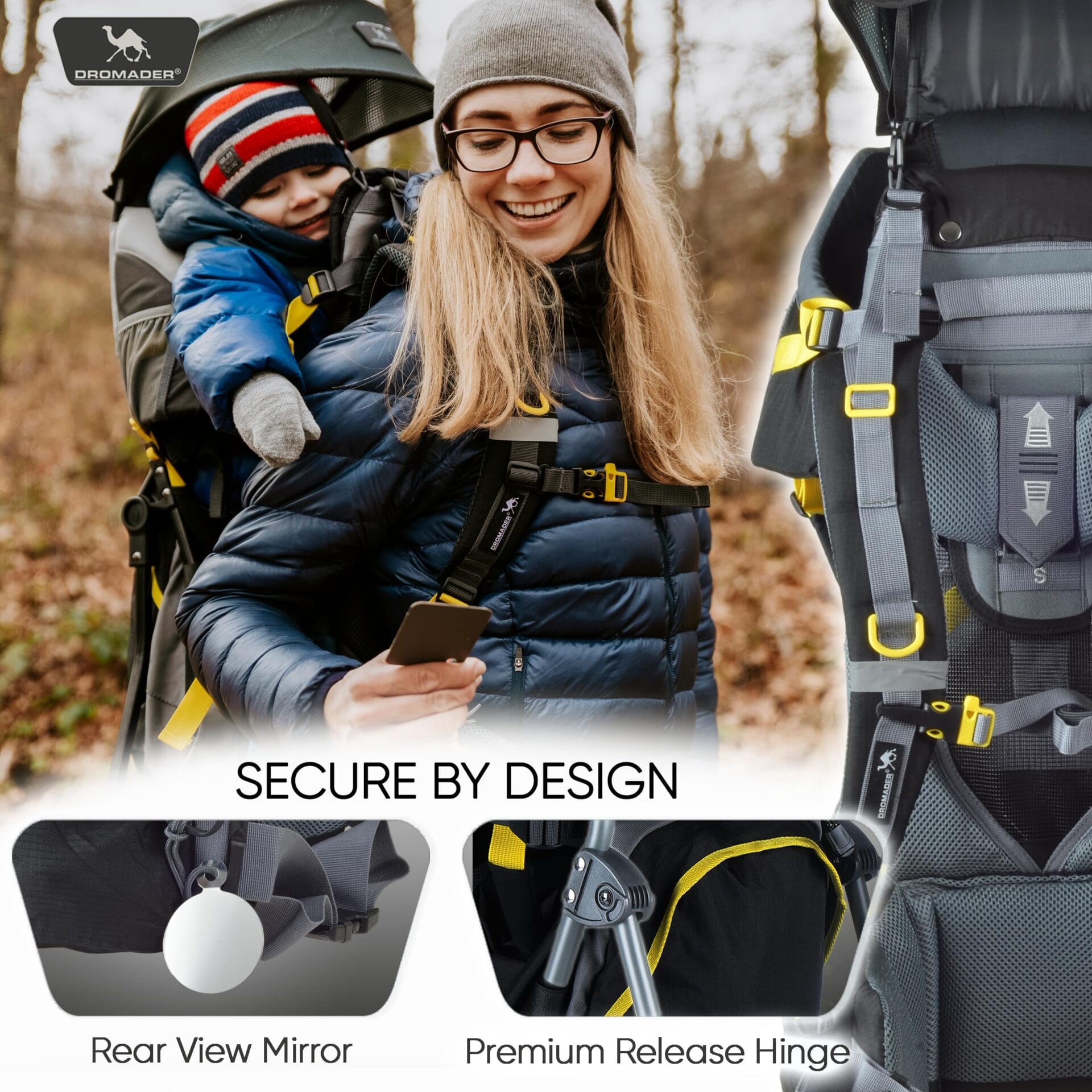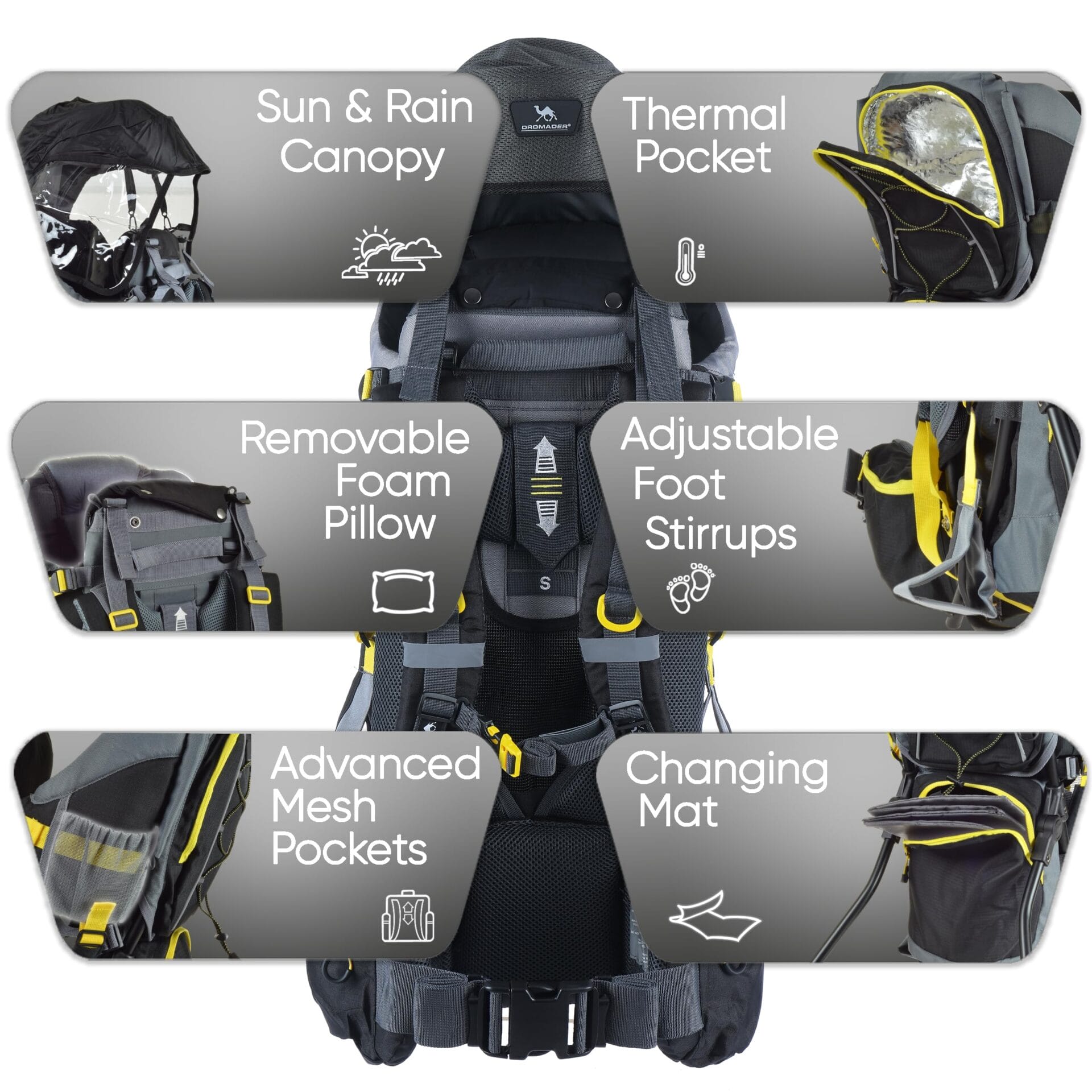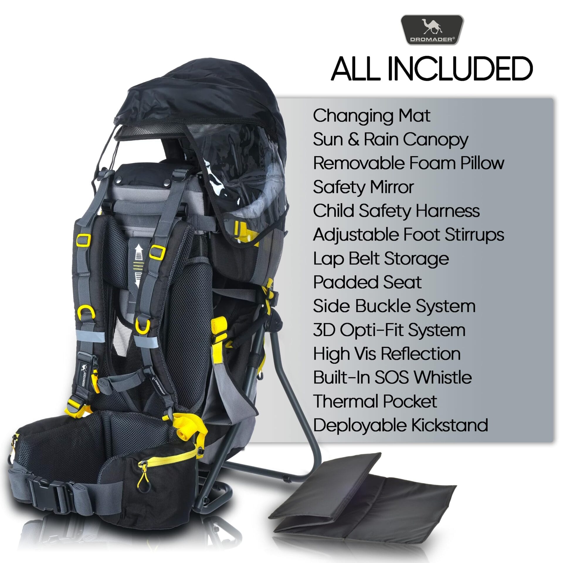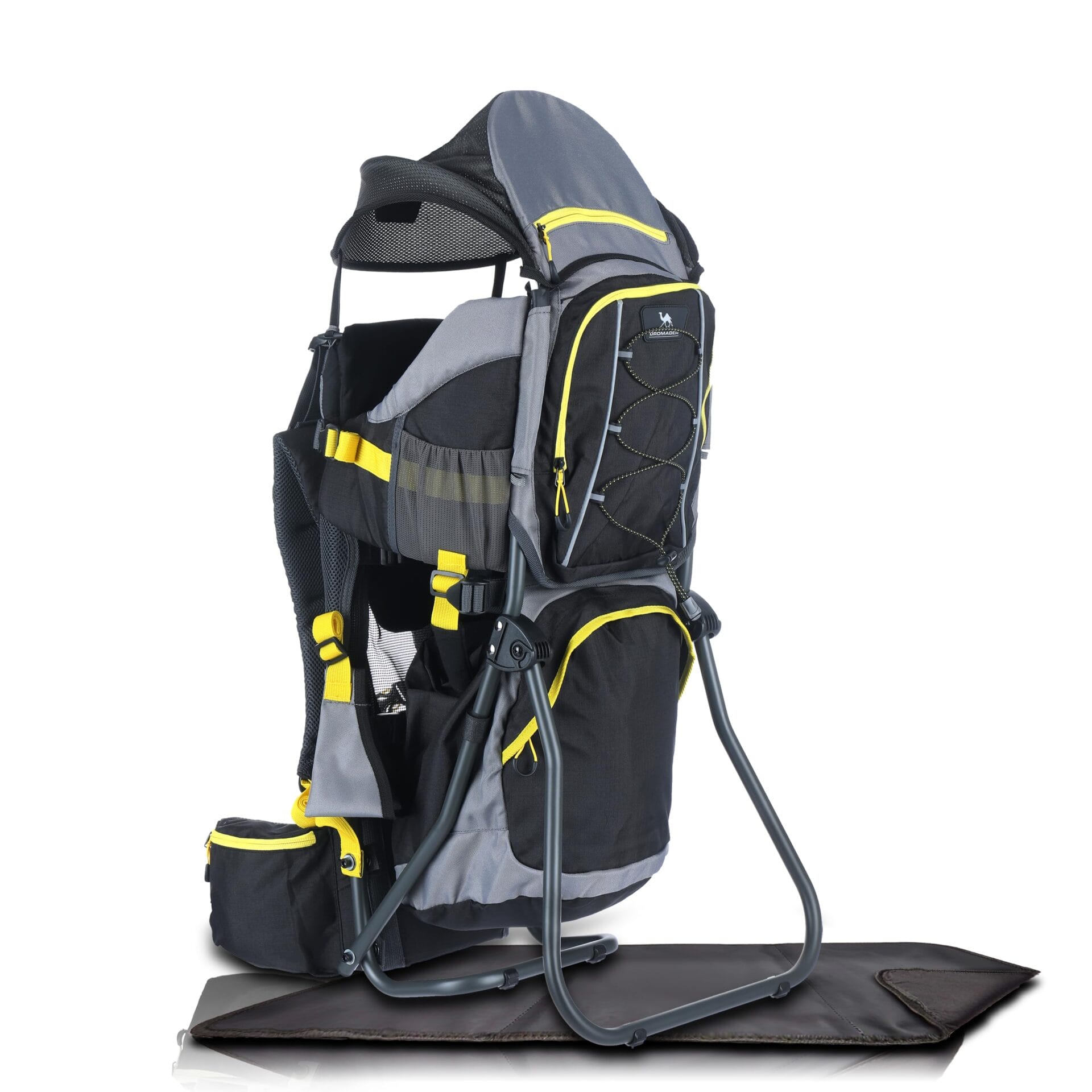 Dromader Nosidełko Turystyczne – Nosidło dla dzieci z daszkiem przeciwsłonecznym, osłoną przeciwdeszczową, kieszenią termiczną, matą do przewijania – Składana rama obsługiwana jedną ręką