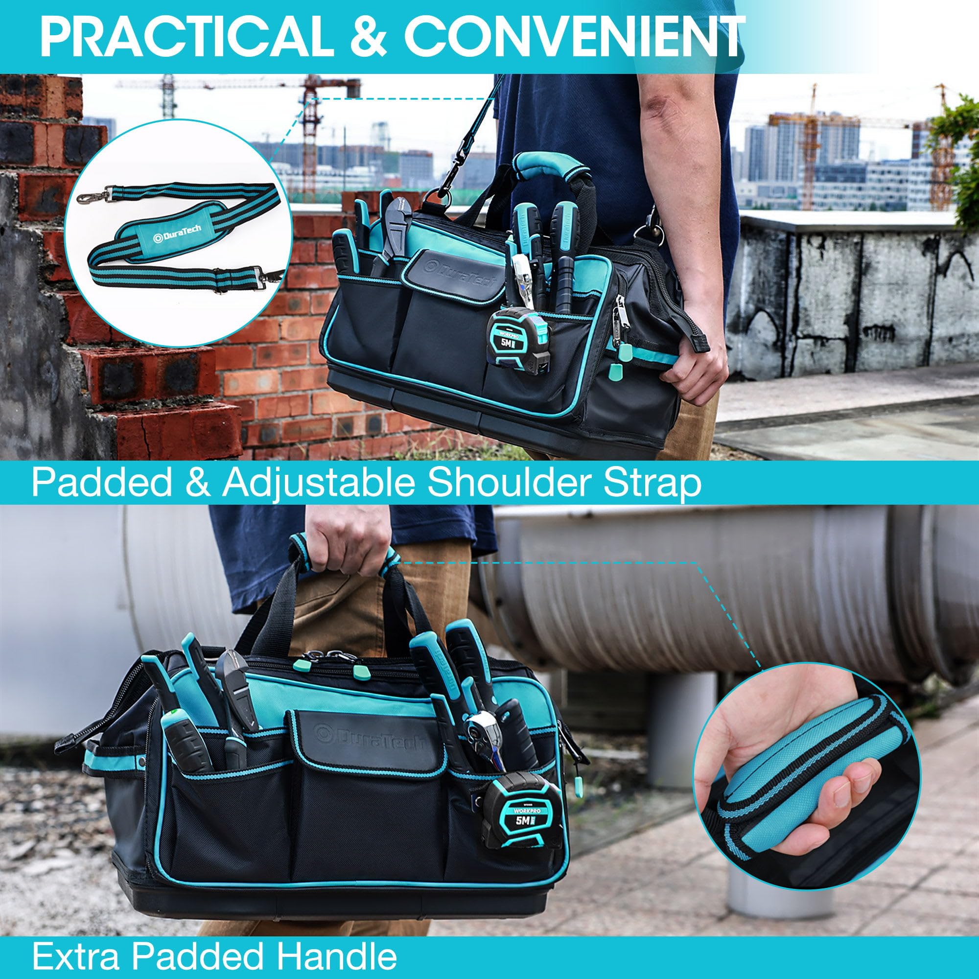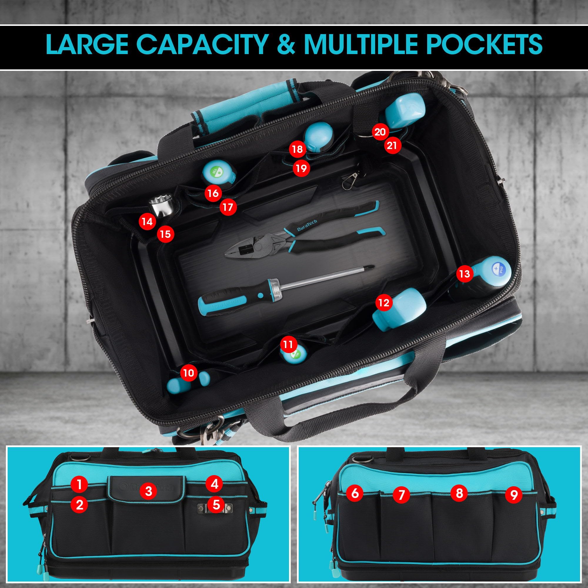 ✅ SUPER DUŻA POJEMNOŚĆ: SUPER DUŻA POJEMNOŚĆ I GŁĘBOKIE KIESZENIE: Torba narzędziowa DURATECH ma wymiary 43L x 29W x 30H cm i może pomieścić prawie wszystkie narzędzia jednocześnie. Dzięki 23 kieszeniom wewnętrznym (20 kieszeni z niebieskimi krawędziami, 2 kieszenie z siatki, 1 kieszeń na zamek błyskawiczny) i 9 kieszeniom