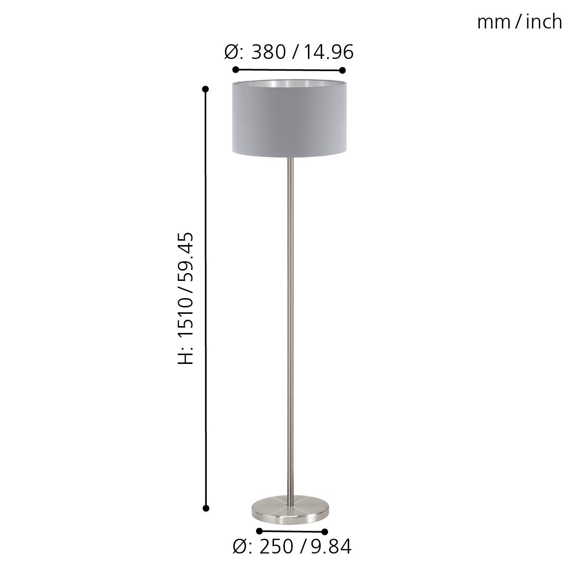 EGLO lampa stojąca Maserlo, 1-punktowa tekstylna lampa podłogowa, lampa stojąca wykonana ze stali i materiału, kolor: matowy nikiel, szary, srebrny, gniazdo: E27, w zestawie przełącznik nożny