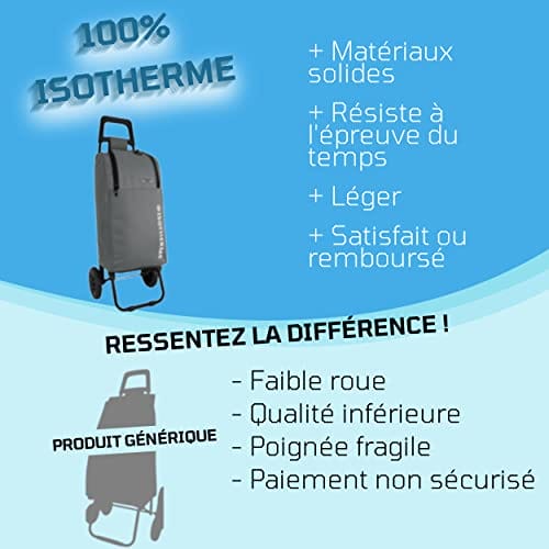 • 100% ISOTERM: Unikalna izolowana komora o dużej pojemności, aby utrzymać zamrożone zakupy z Picarda lub domów towarowych, supermarketów, rynków dobrze chłodzi czas transportu do domu. Kieszeń jest wyposażona w zamek błyskawiczny, który otwiera się i zamyka nawet przy wadze zamrożonych produktów. Umożliwia łatwe przechowywanie dzięki sztywnej podstawie stabilizującej, która pozwala na uporządkowane i stabilne wyścigi. Torba jest wyjmowana, wodoodporna i nadająca się do prania.