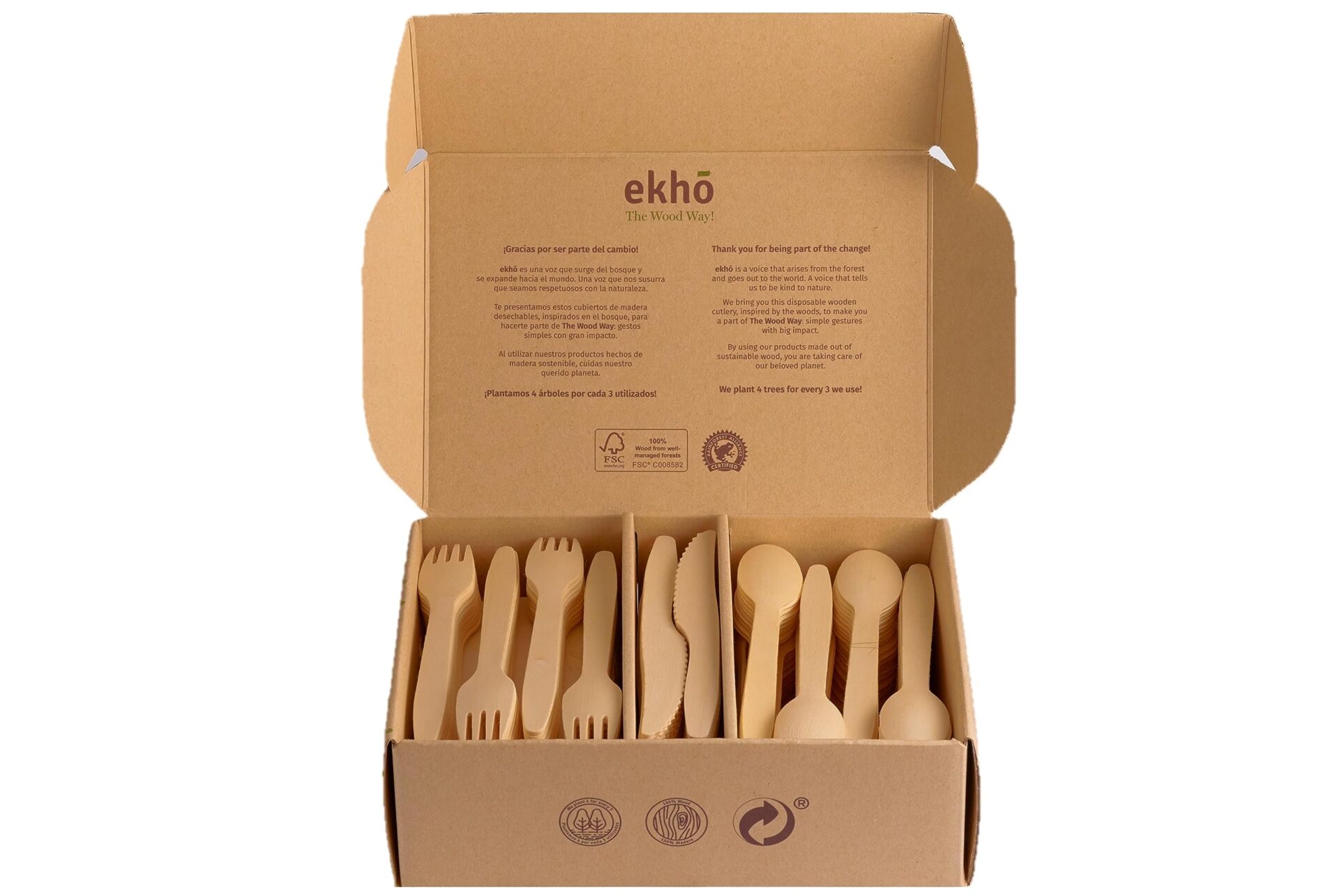 Ekho The Wood Way to wyjątkowy zestaw sztućców jednorazowych, który łączy w sobie ekologię, funkcjonalność i estetykę. W skład zestawu wchodzi 300 sztuk sztućców wykonanych z drewna ekologicznego, w tym 120 widelców, 120 łyżek oraz 60 noży. Dzięki zastosowaniu naturalnych materiałów, sztućce te są w pełni biodegradowalne i nadają się do kompostowania, co czyni je idealnym wyborem dla osób dbających o środowisko.