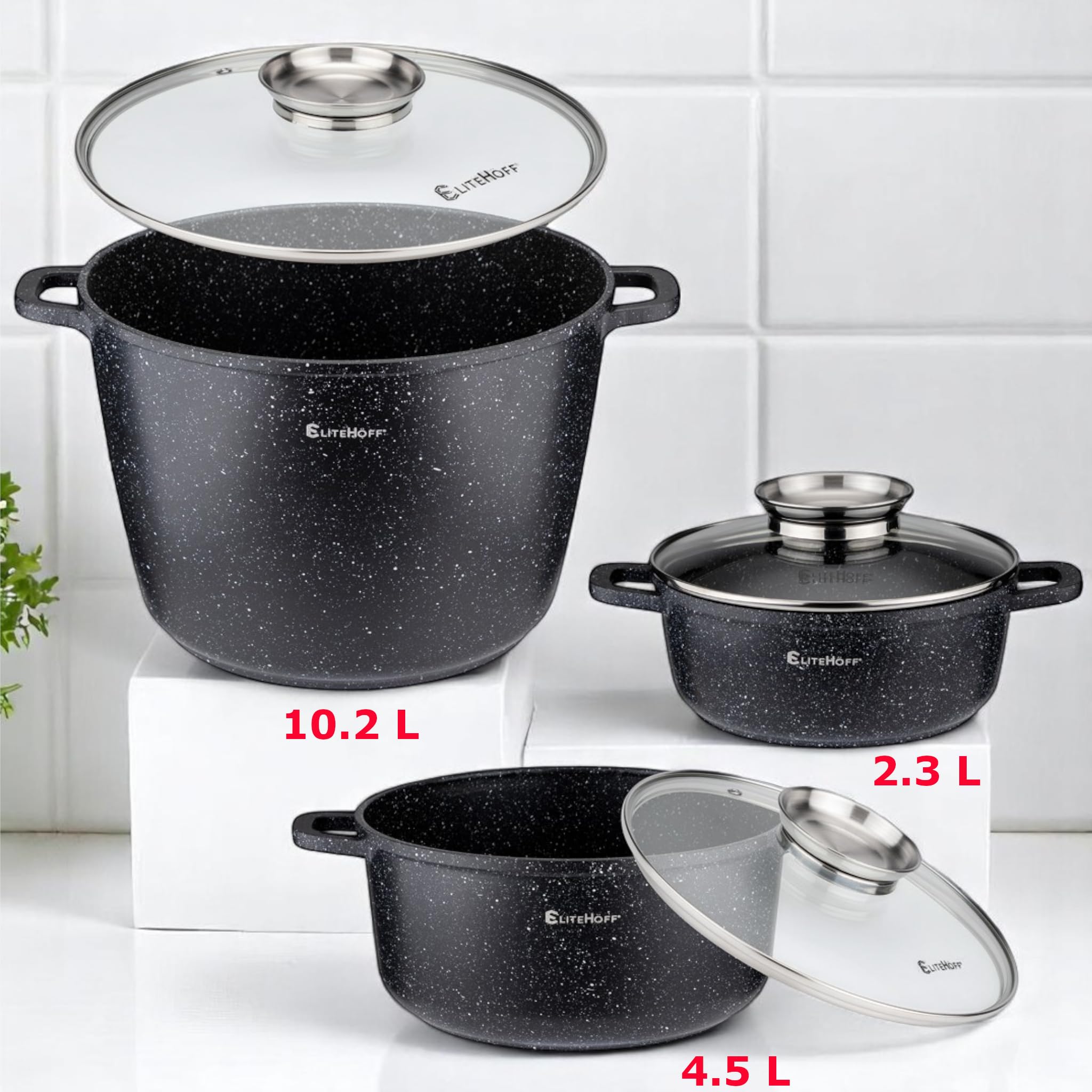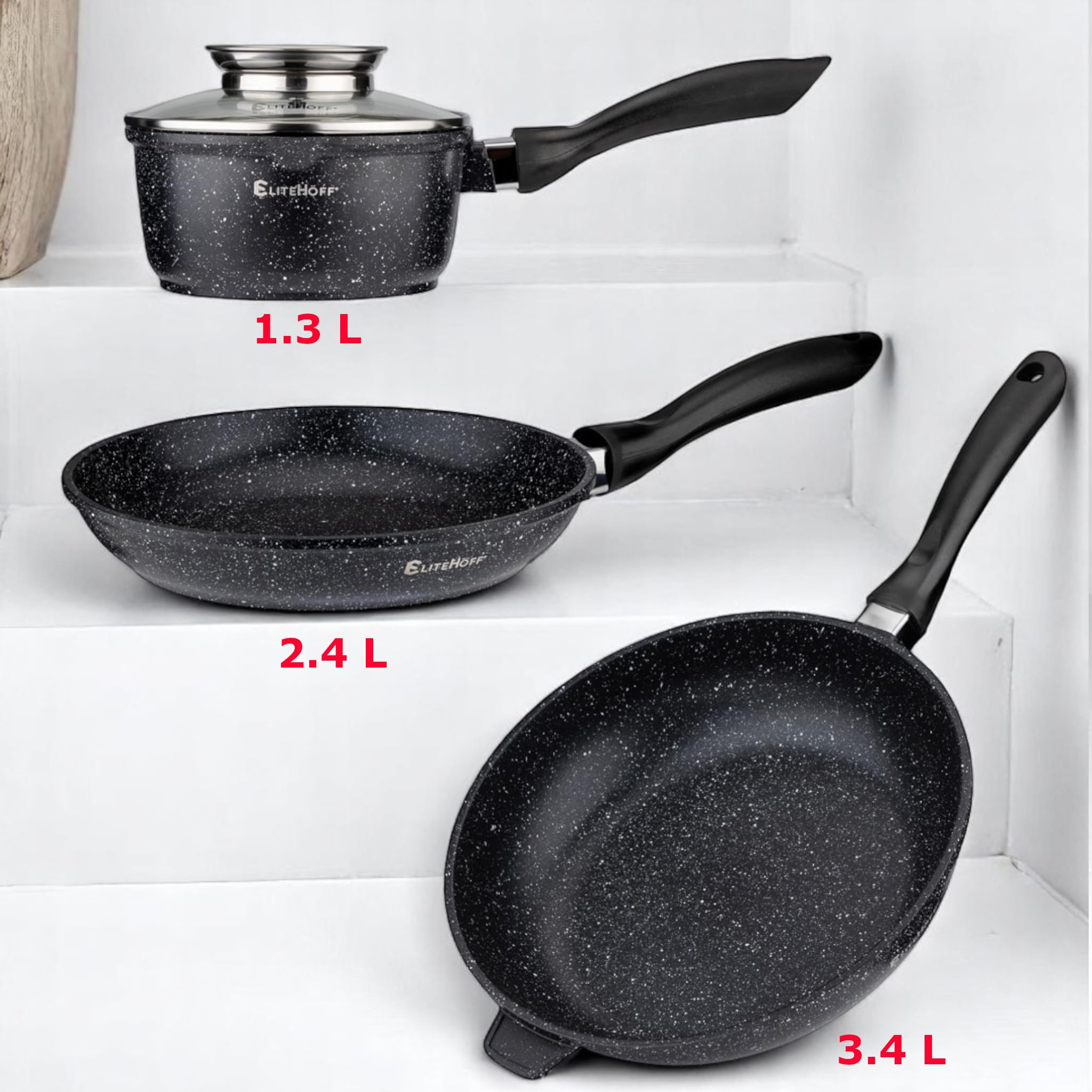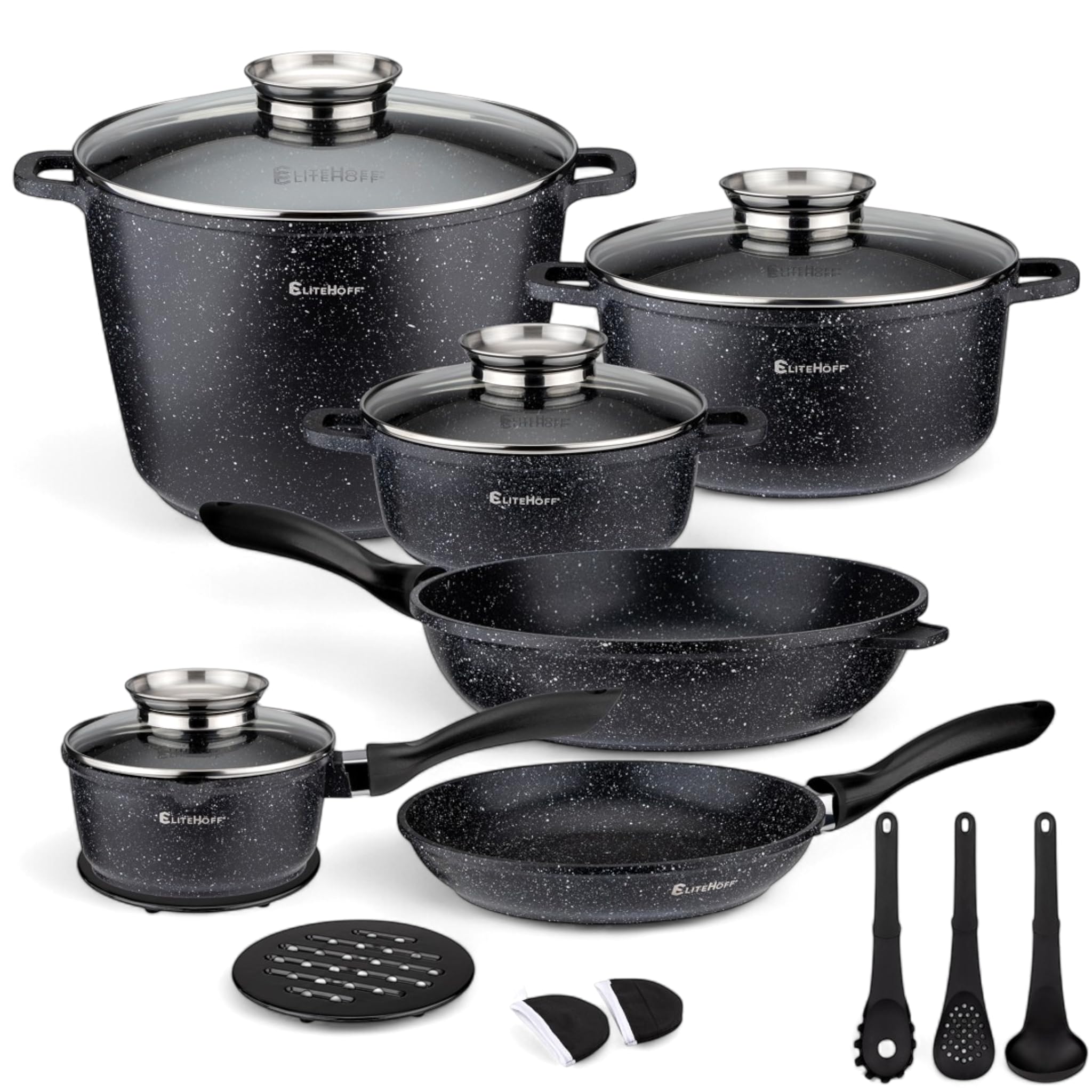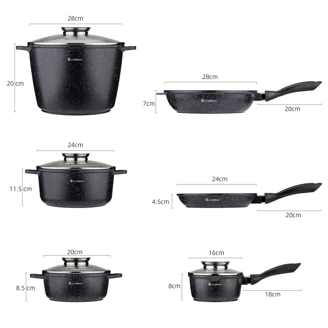 EliteHoff 17-Częściowy Zestaw Garnków z Pokrywkami i Patelni – Zestaw Garnków Indukcyjnych z Powłoką Nieprzywierającą, Do Wszystkich Rodzajów Kuchenek, Można Myć w Zmywarce, bez PFOA (Czarny, E-7026)
