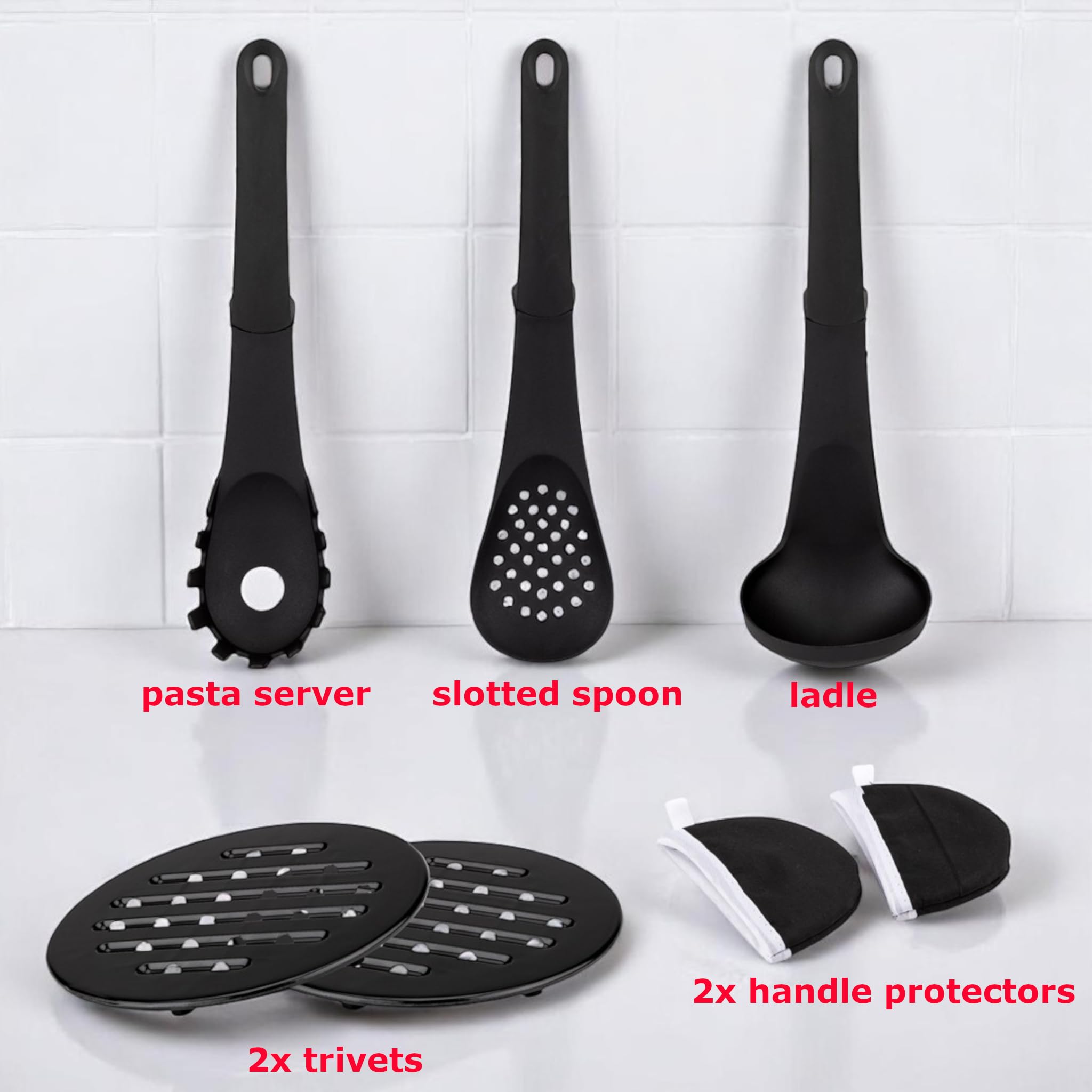 - Dołączone komponenty: 3 garnki do gotowania, 1 rondel z uchwytem, 4 pokrywki, 2 patelnie do smażenia, 2 podstawki, 2 odporne na ciepło uchwyty z uchwytami, 1 łyżka do mak