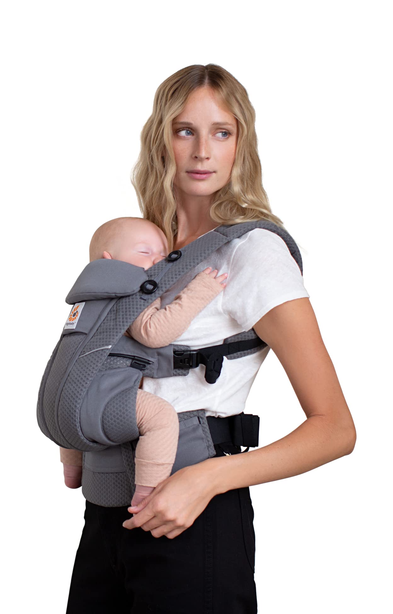 • ERGONOMICZNE NOSIDEŁKO – 4 pozycje noszenia: Na brzuszku, na biodrze, na plecach i przodem do kierunku jazdy. Regulowana szerokość pałąka umożliwia noszenie dziecka od urodzenia do wieku niemowlęcego (3,2-20,4 kg) w naturalnej, ergonomicznej pozycji od siedzącej do stojącej (pozycja M)