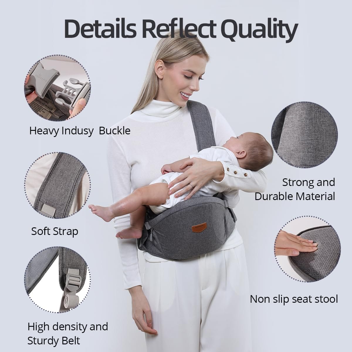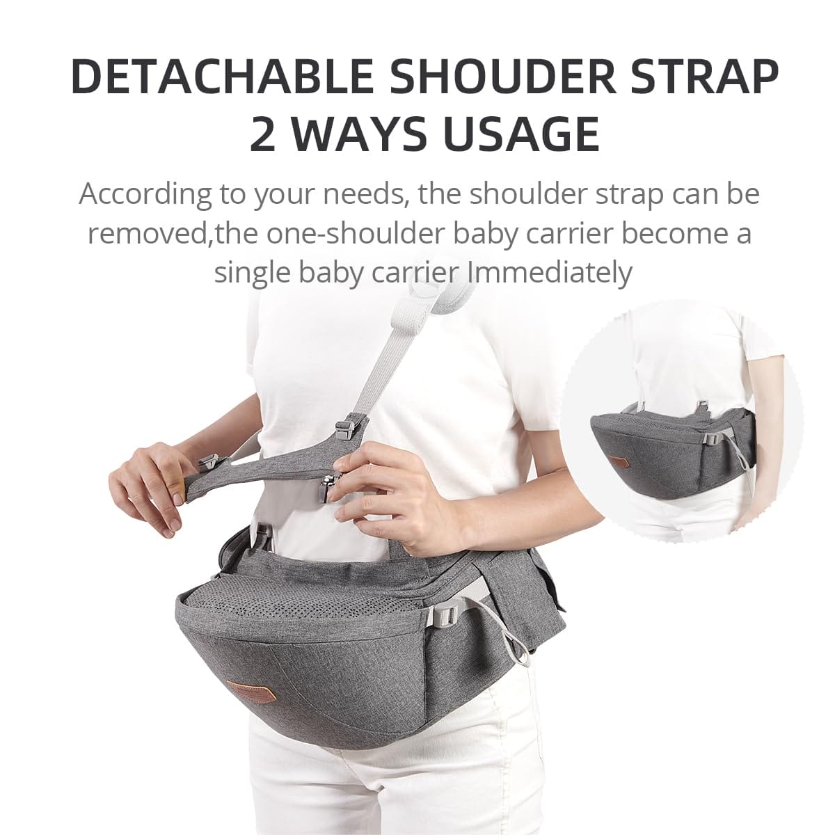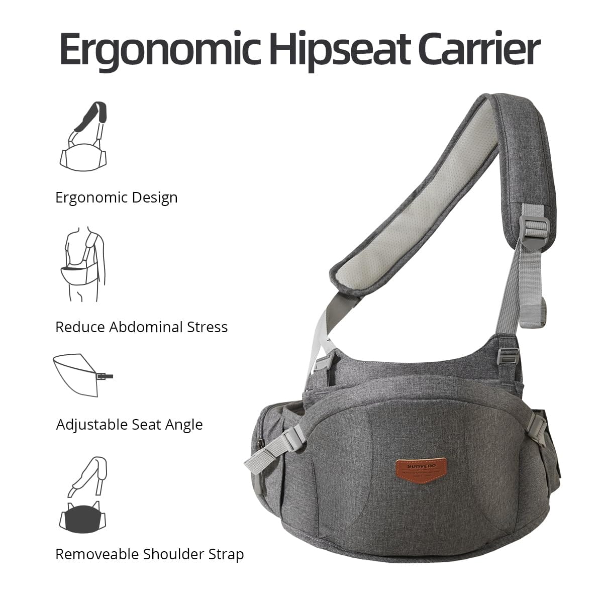 • Ergonomicznie zaprojektowany: Zapewnia wygodną pozycję siedzącą dla dziecka, w przeciwieństwie do tradycyjnego nosidełka, które powoduje nacisk i dyskomfort na delikatne biodra, zapewnia zdrowy rozwój szkieletu we wszystkich pozycjach siedzenia; może być używany samodzielnie, w połączeniu z paskiem na ramię lub z woreczkiem; dopasowuje się do wzrostu od dziecka do malucha; wyściełane krawędzie chronią wrażliwą skórę dziecka