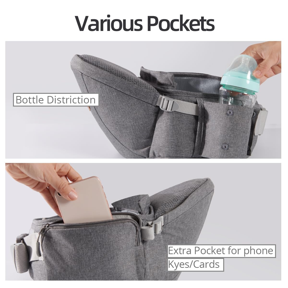 • Wiele kieszeni do przechowywania: Nosidełko dla niemowląt jest wyposażone w 2 duże kieszenie do przechowywania i 1 torbę na butelki, można wrzucić pieluchy i chusteczki do przechowywania pod siedzeniem. Uzyskaj dostęp do kluczy, telefonu i smoczków w bocznych kieszeniach, przechowuj butelkę w torbie na butelki