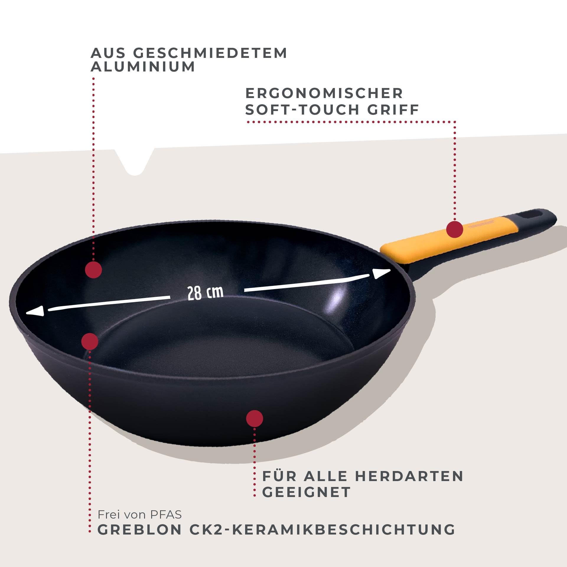 Fackelmann 1PC Soft Wok to doskonały wybór dla wszystkich miłośników gotowania. Wykonany z kutej aluminium z powłoką ceramiczną Greblon, ten wok o średnicy 28 cm zapewnia doskonałe właściwości nieprzywierania, co ułatwia przygotowywanie potraw bez dodatku tłuszczu.