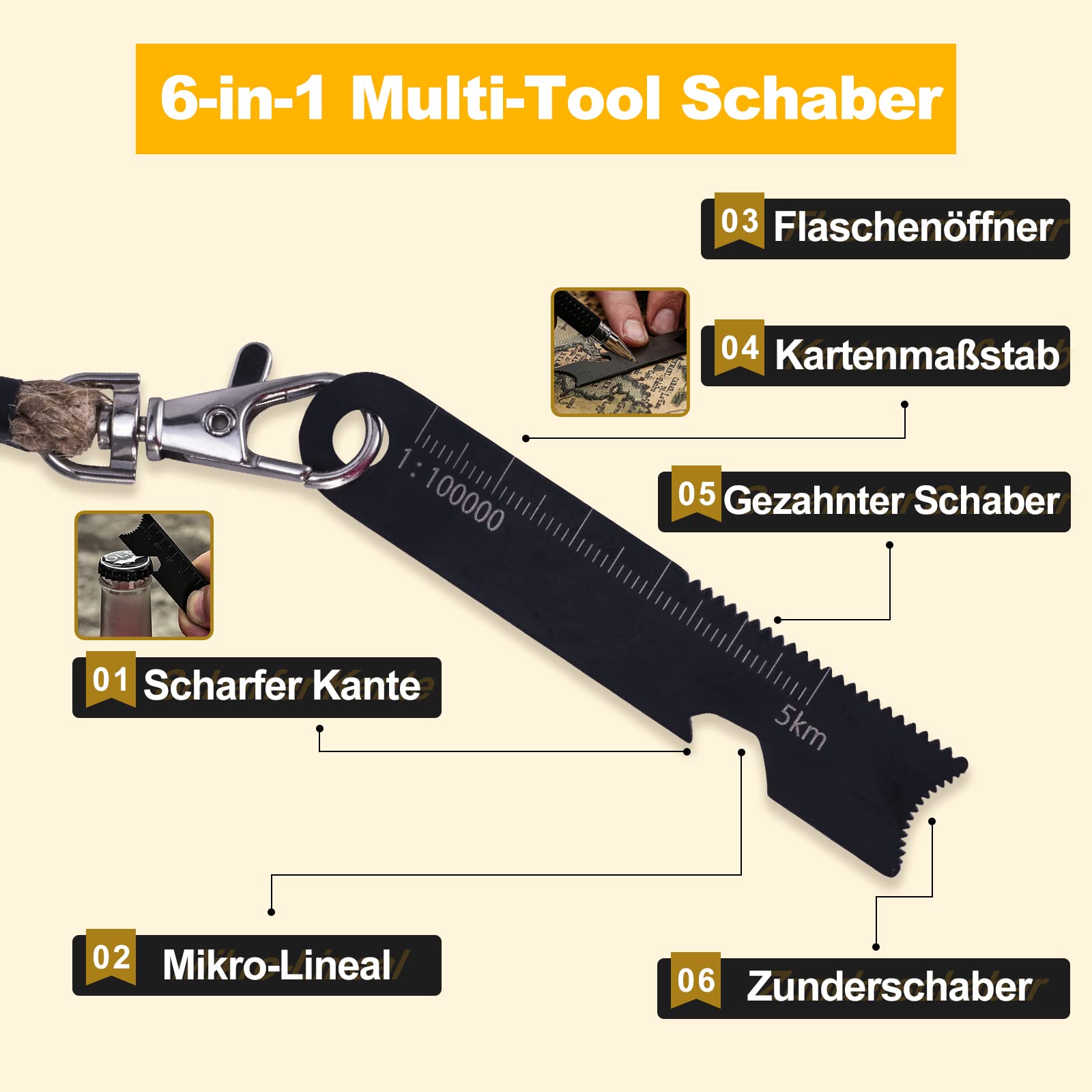 Krzesiwo 7 w 1 XL zawiera również wbudowany kompas, co czyni go idealnym towarzyszem podczas wędrówek i biwaków. Dzięki temu, użytkownik nie tylko ma możliwość rozpalenia ognia, ale także łatwego nawigowania w terenie.