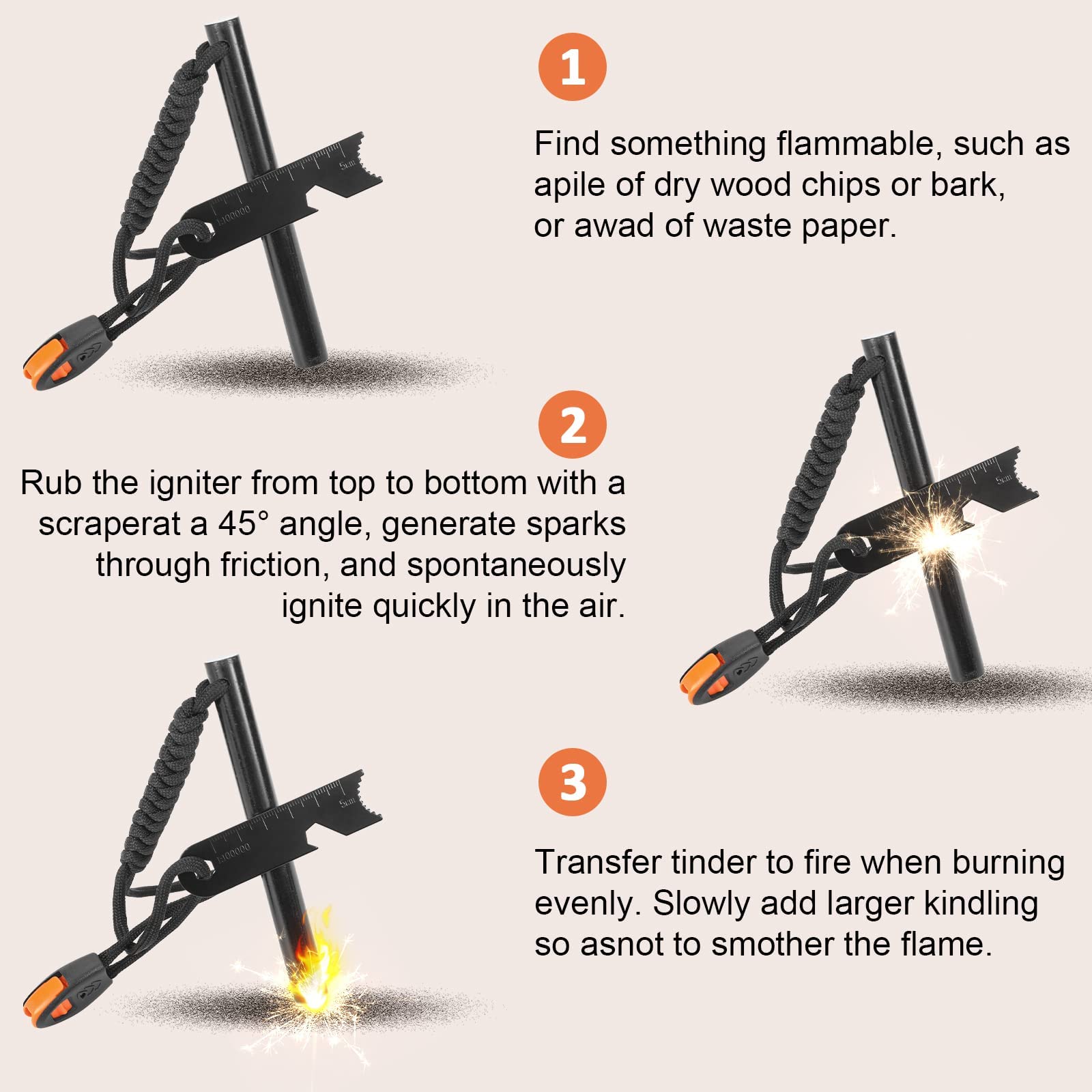 Uchwyt wykonany z paracordu nie tylko zapewnia pewny chwyt, ale także może być wykorzystany w sytuacjach awaryjnych – paracord to wytrzymała lina, która ma wiele zastosowań, od budowy schronienia po naprawy sprzętu. Krzesiwo magnezowe w zestawie umożliwia szybkie i efektywne rozpalanie ognia, co jest kluczowe w sytuacjach survivalowych.
