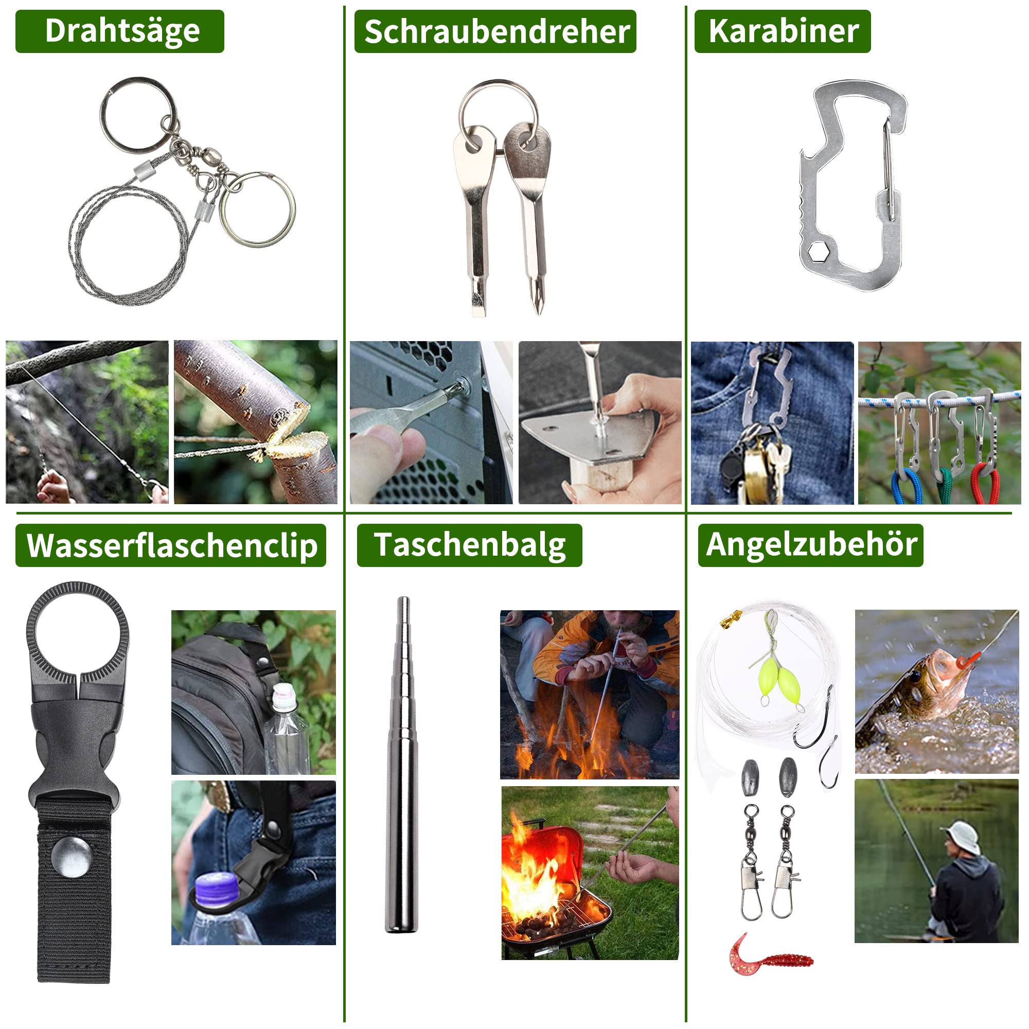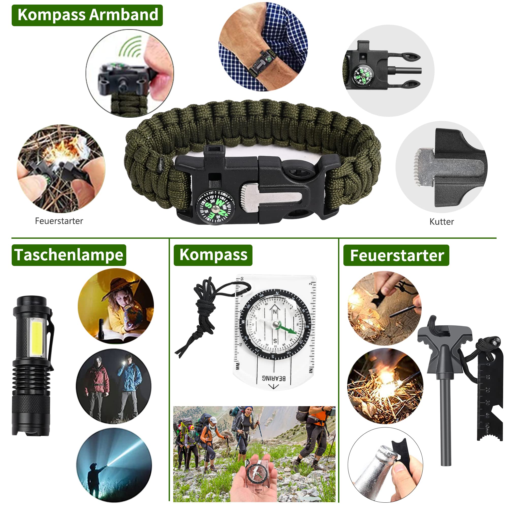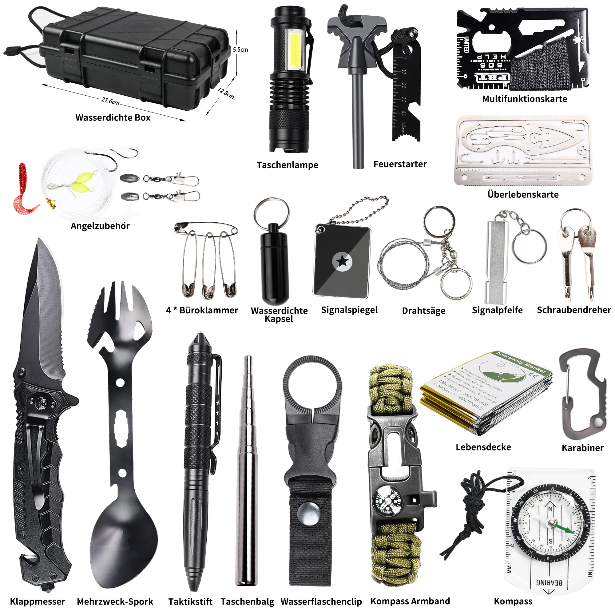 FINIBO Zestaw survivalowy 21 w 1 to kompleksowe rozwiązanie dla miłośników outdooru, które wyróżnia się na tle konkurencji dzięki swojej wszechstronności i wysokiej jakości wykonania. Zestaw zawiera niezbędne akcesoria, które mogą okazać się kluczowe w sytuacjach awaryjnych oraz podczas aktywności na świeżym powietrzu, takich jak kemping, bushcraft, piesze wycieczki czy polowanie.
