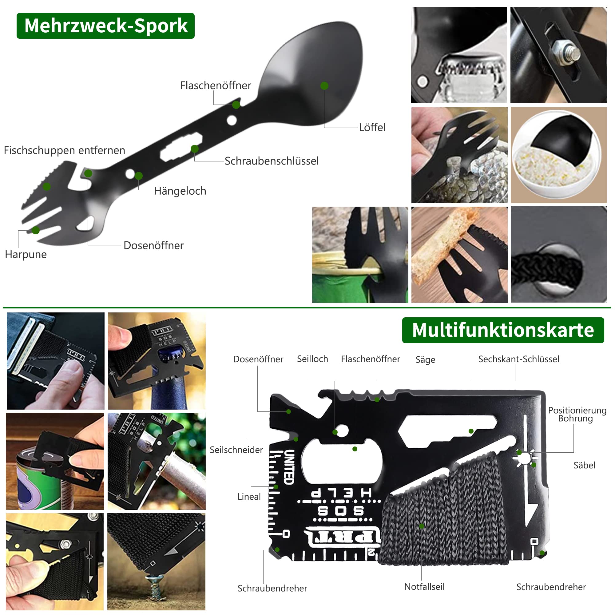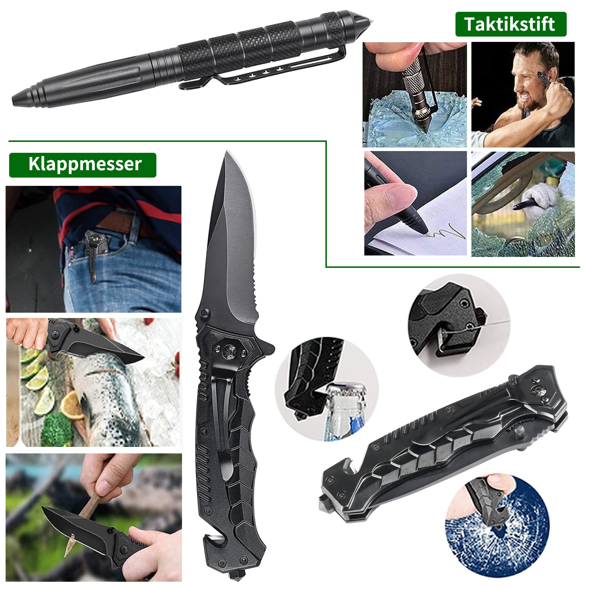 W skład zestawu wchodzi m.in. latarka taktyczna o wysokiej mocy, która zapewnia doskonałą widoczność w ciemności, oraz precyzyjny kompas, który ułatwia orientację w terenie. Dodatkowo, zestaw zawiera narzędzia wielofunkcyjne, które łączą w sobie funkcje noża, śrubokrętu i innych przydatnych akcesoriów, co czyni go niezwykle praktycznym w różnych sytuacjach.
