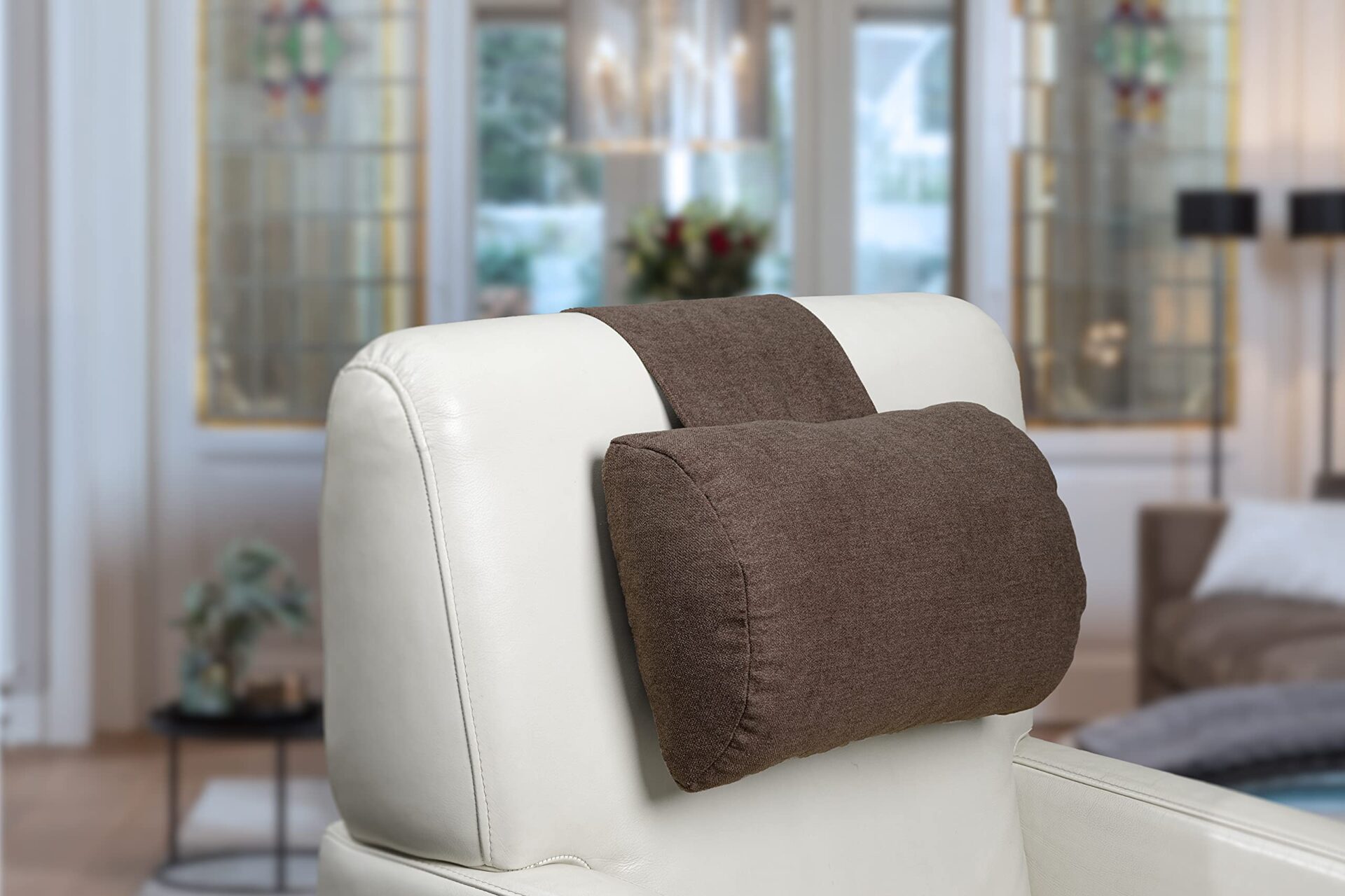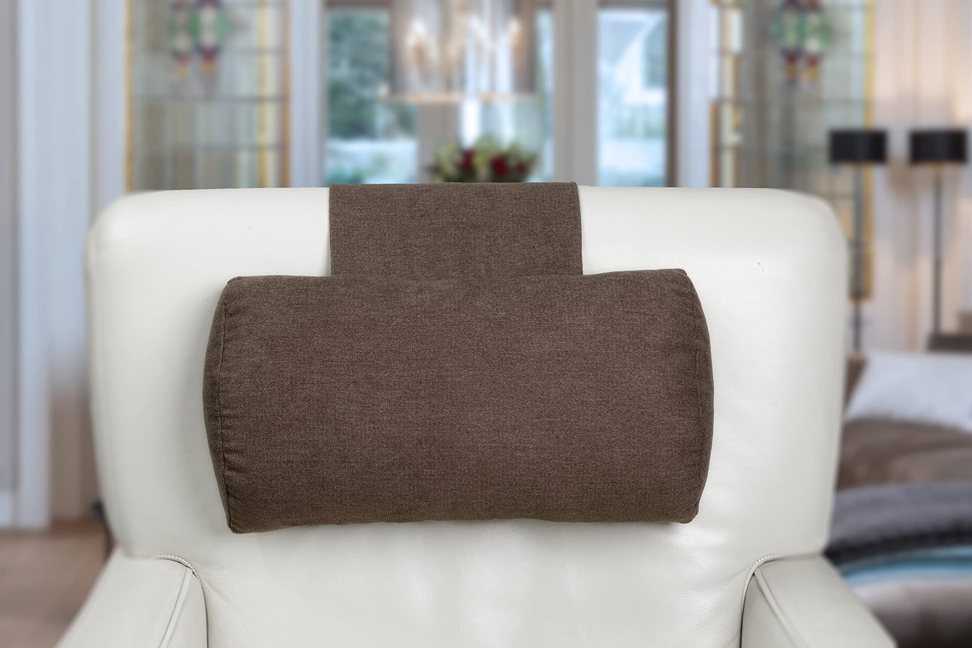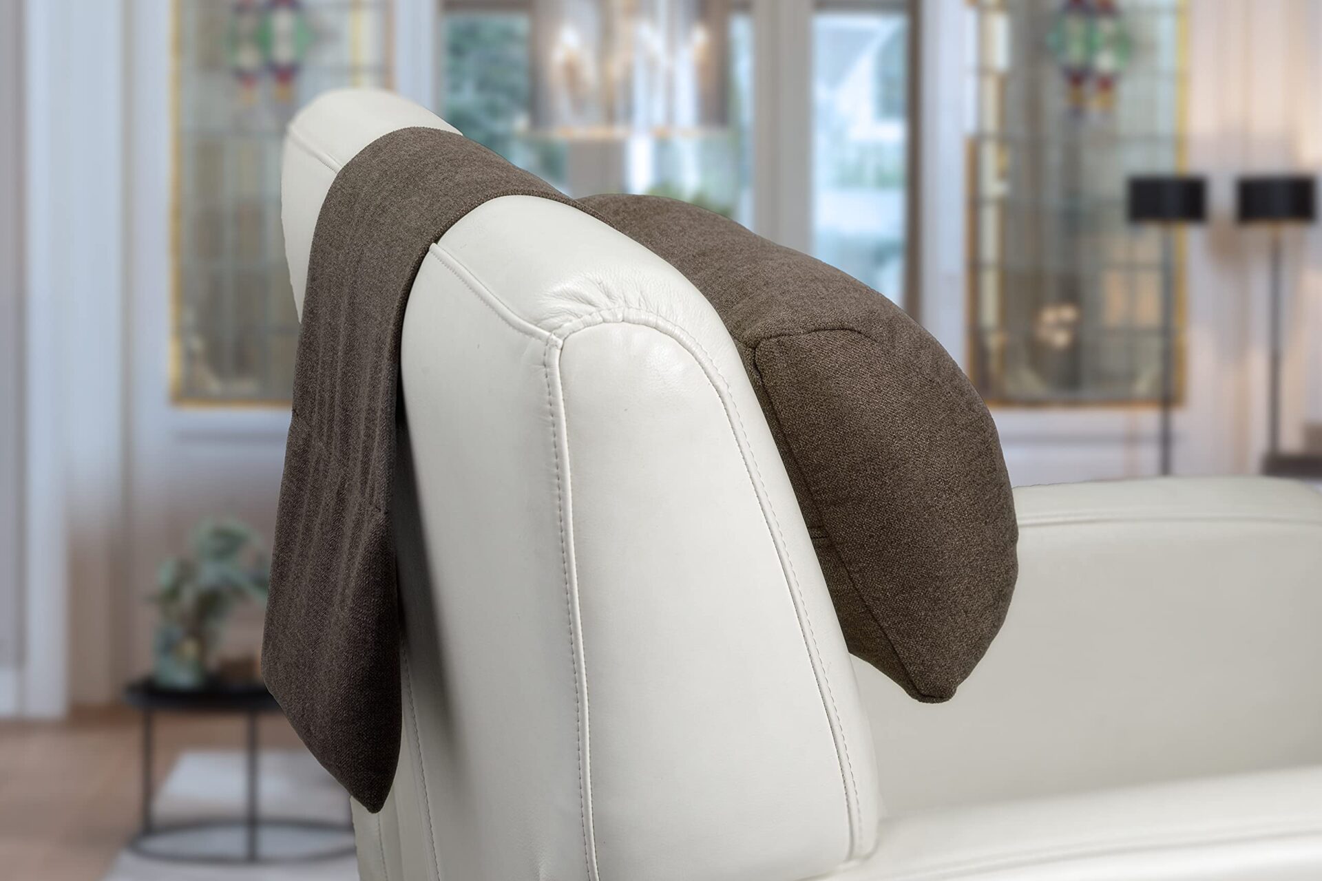 Fińska komfort Poduszka na szyję do fotela i krzeseł, szerokość 40 cm – regulowana poduszka z ergonomicznym podparciem i przeciwwagą – zmywalna, oddychająca i miękka -Brązowy szary