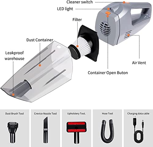 5. MULTIFUNKTIONALES ZUBEHÖR: Odkurzacz jest dostarczany z trzema dodatkowymi, wartościowymi akcesoriami. Przedłużana rura może być połączona z szczotką, co umożliwia czyszczenie trudno dostępnych miejsc w domu lub samochodzie. Końcówka w kształcie dzioba kaczki jest idealna do czyszczenia szczelin i wylotów klimatyzacji.