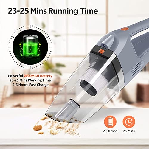 2. USB-Schnellladung und bequemer: Odkurzacz bezprzewodowy Fityou jest wyposażony w wbudowany akumulator o pojemności 2000 mAh x 3, który zapewnia długotrwałe użytkowanie. Pełne naładowanie zajmuje tylko 4-6 godzin, a czas pracy wynosi od 23 do 25 minut. Dzięki temu odkurzacz jest lekki, przenośny i idealny do użytku w dowolnym miejscu.