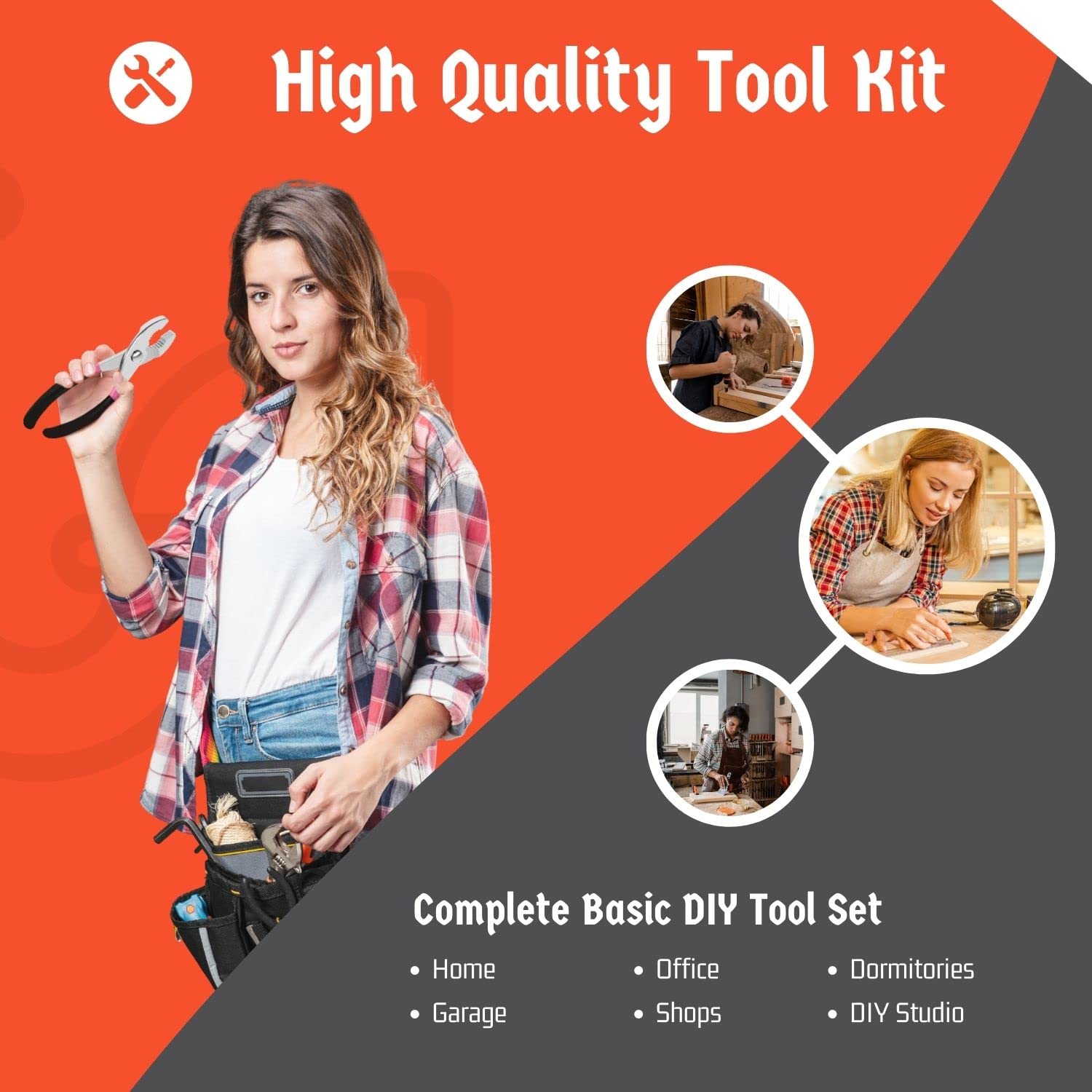 Kompletny zestaw narzędzi: Kompletny zestaw narzędzi podstawowych – ten mały zestaw narzędzi zawiera niezbędne narzędzia wymagane do większości gospodarstw domowych, napraw i konserwacji mechanicznych. Nadaje się do drewna, metalu, rzemiosła, dekoracji, montażu, budynków oraz napraw domu i warsztatu. Ten przydatny pakiet narz