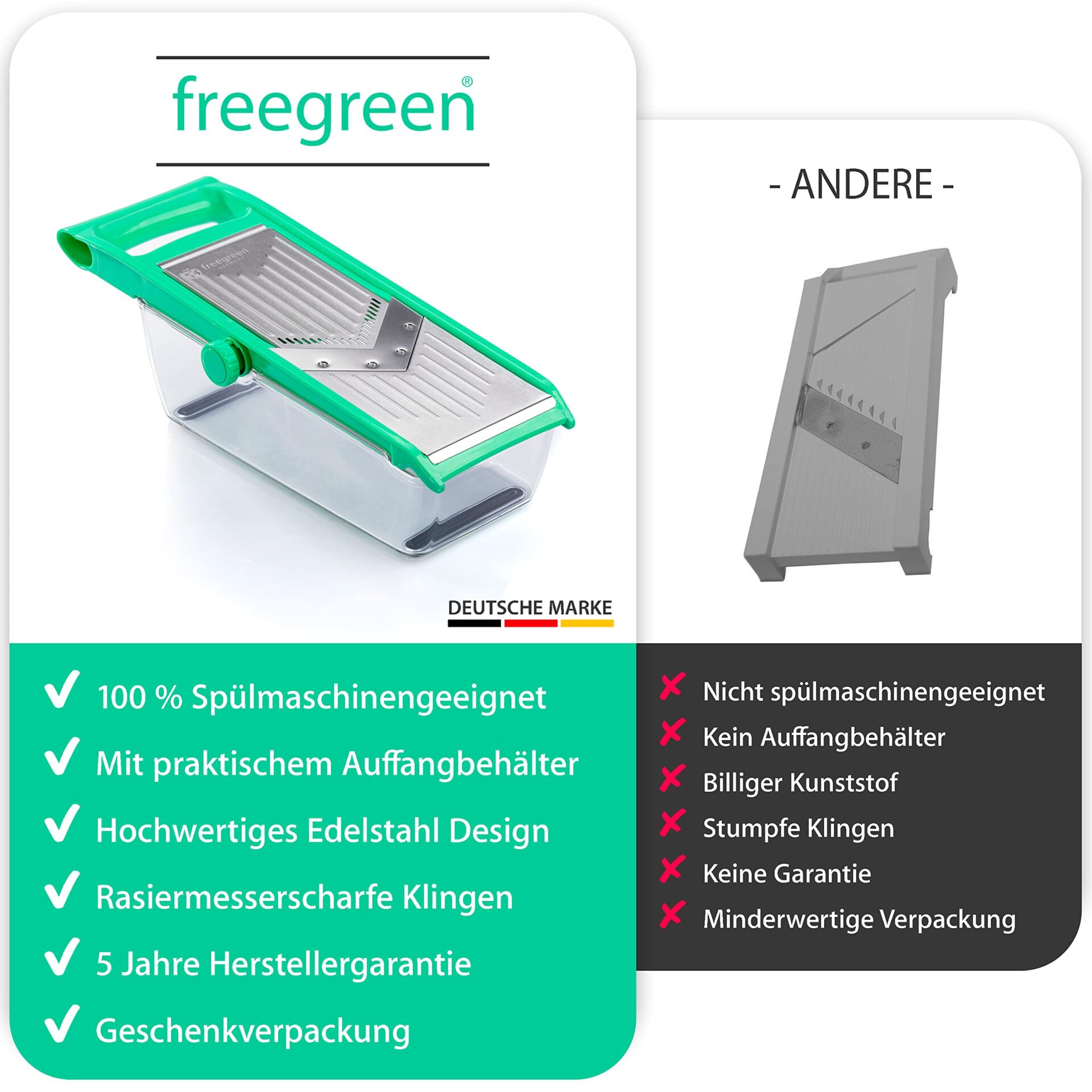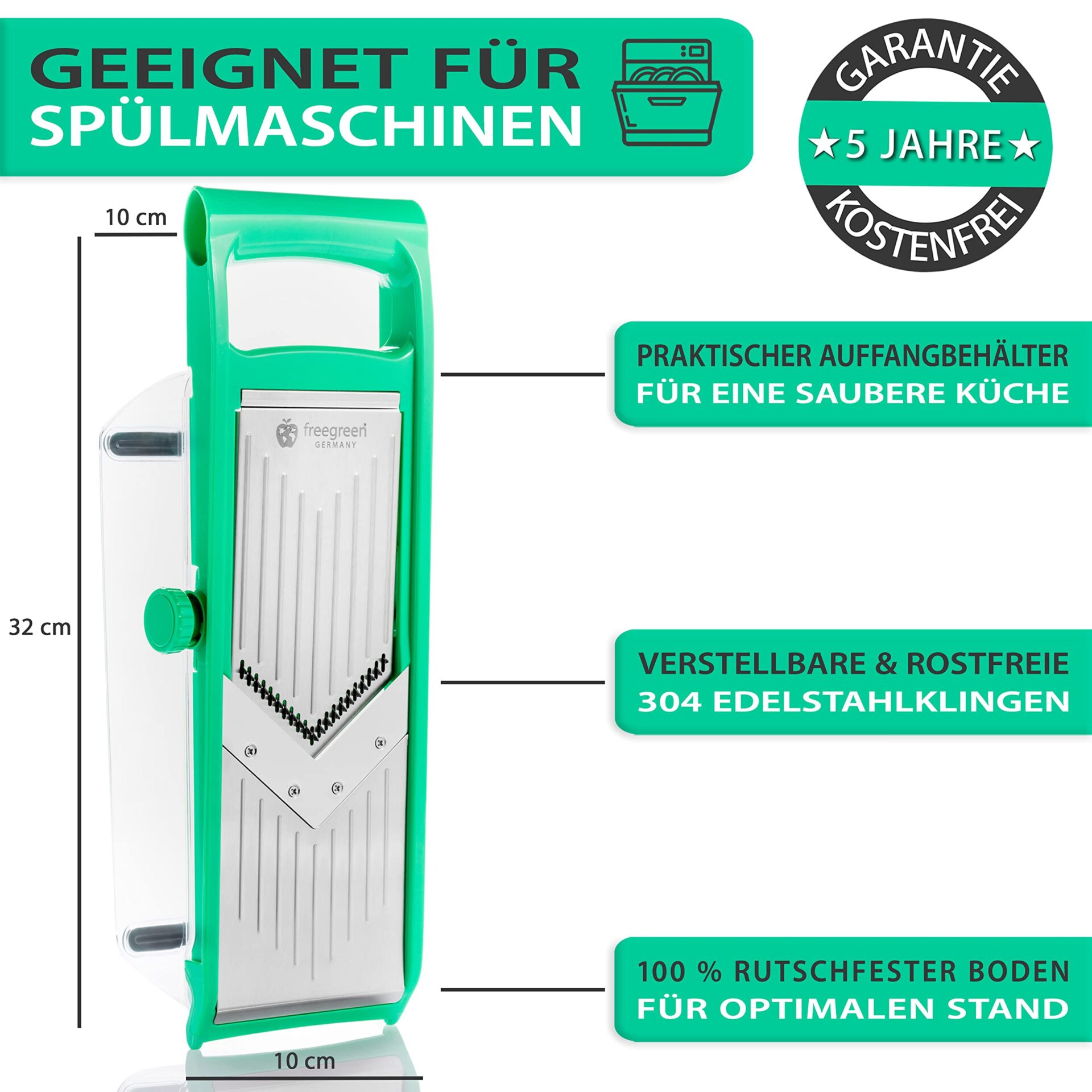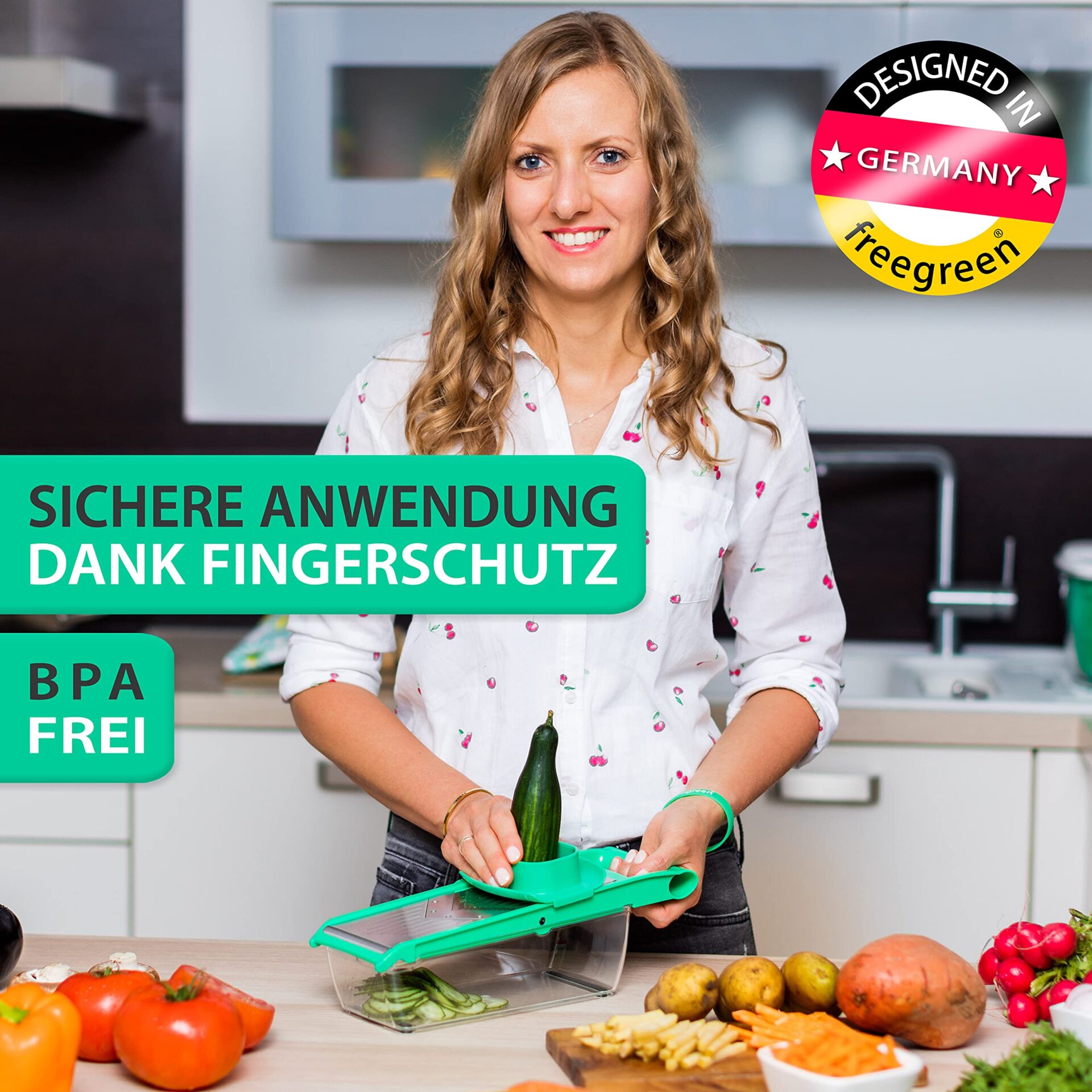 freegreen Germany szatkownica do owoców i warzyw ze stali nierdzewnej z ostrzem w kształcie litery V i pojemnikiem na ścinki, z uchwytem na warzywa do idealnych plasterków owoców i warzyw oraz pasków