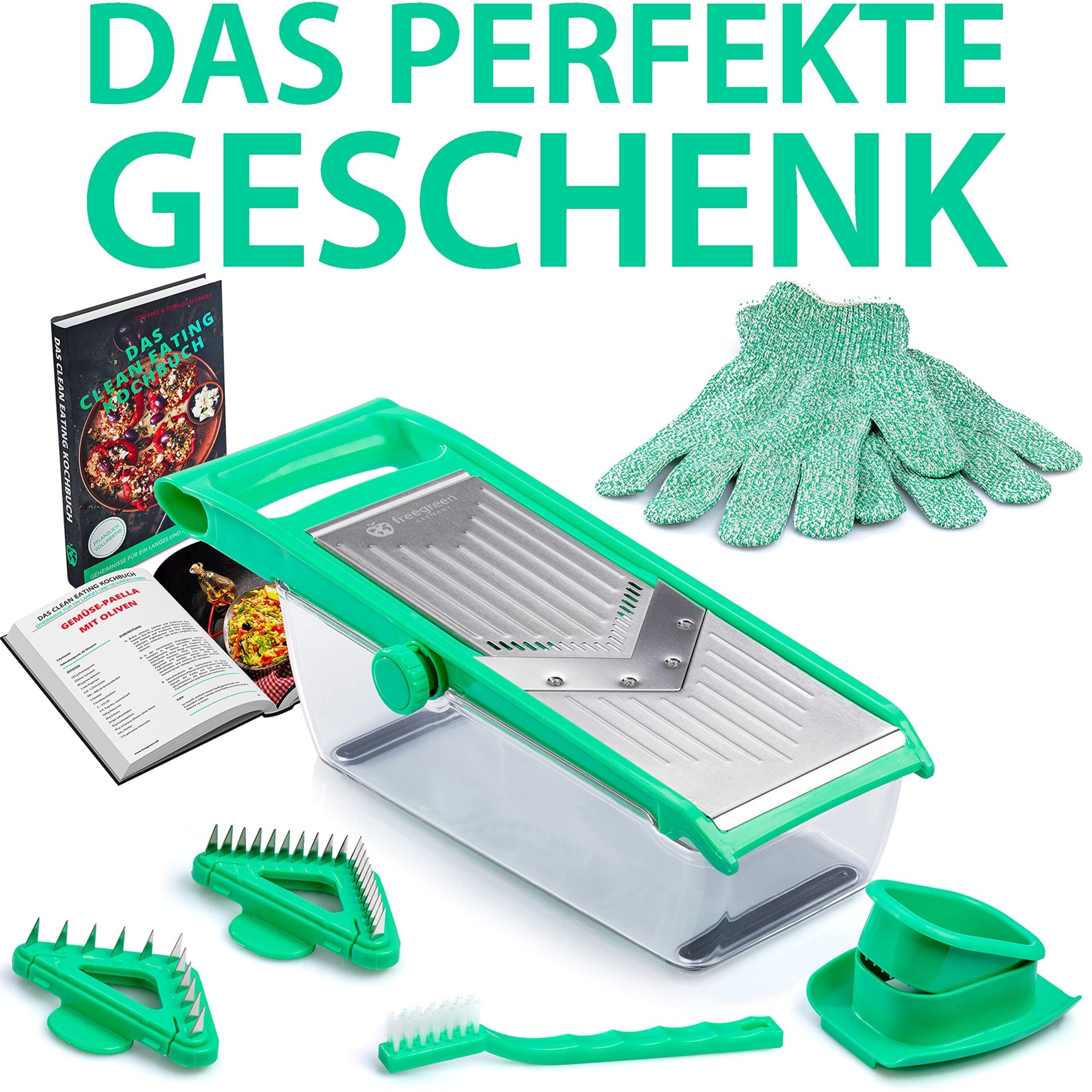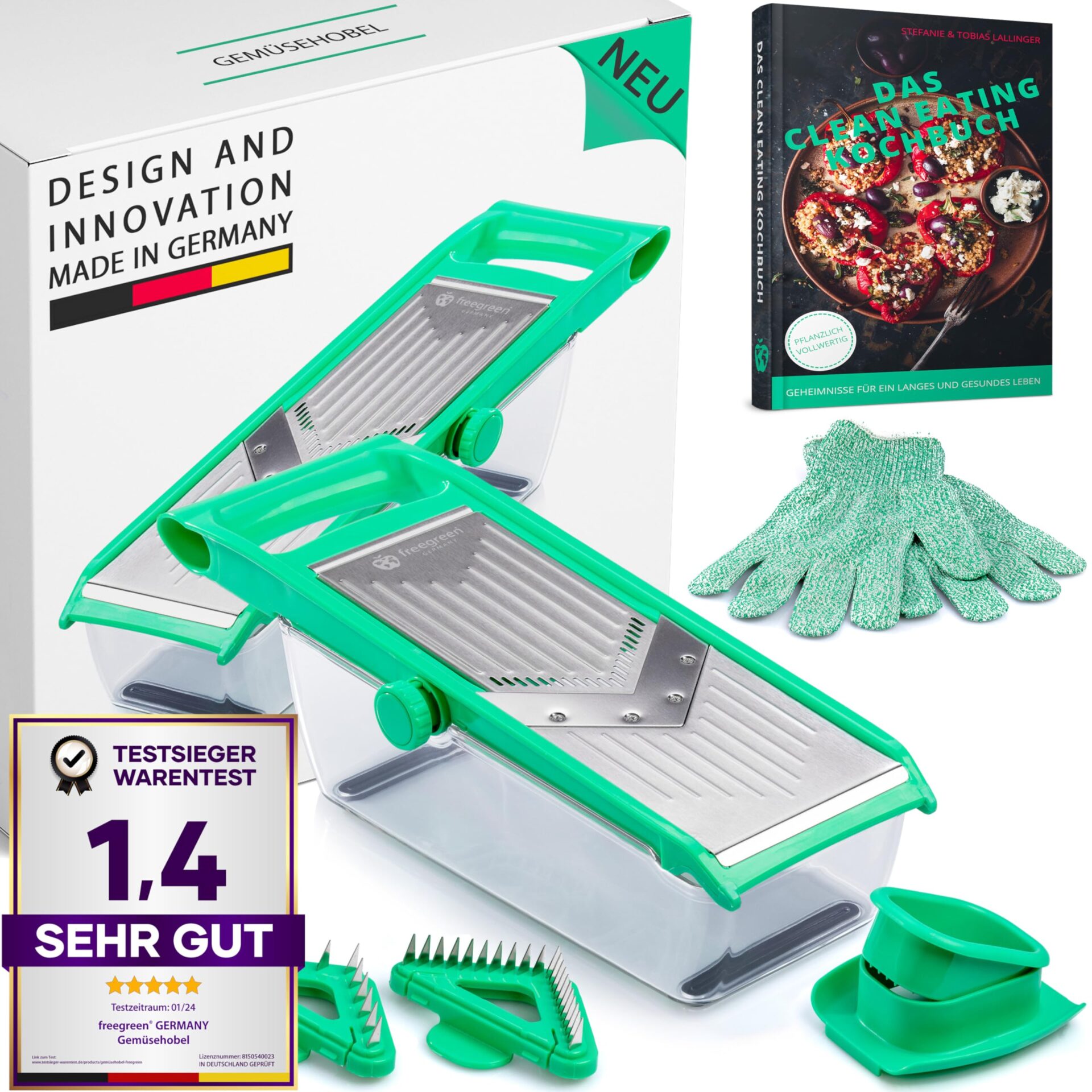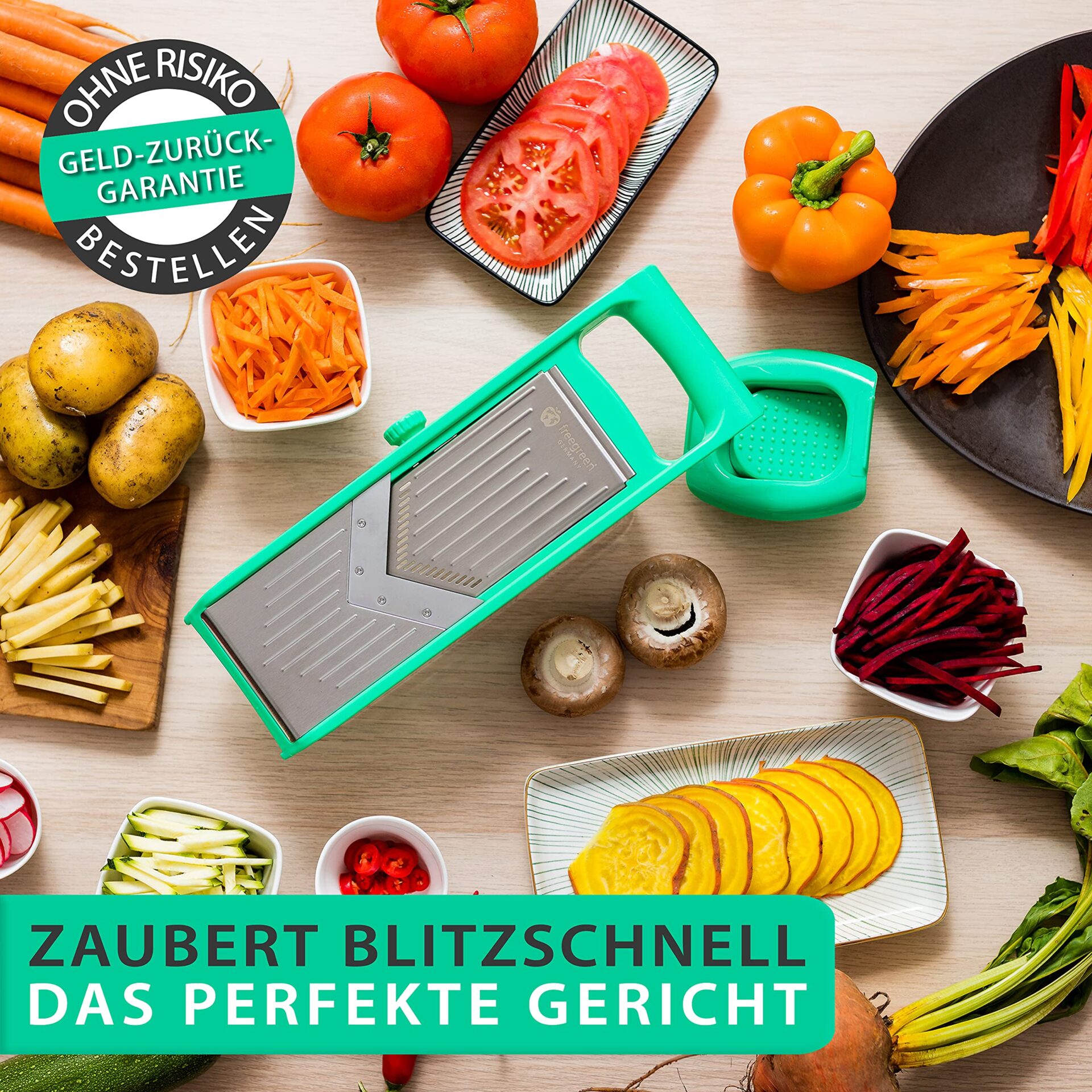 freegreen Germany szatkownica do owoców i warzyw ze stali nierdzewnej z ostrzem w kształcie litery V i pojemnikiem na ścinki, z uchwytem na warzywa do idealnych plasterków owoców i warzyw oraz pasków