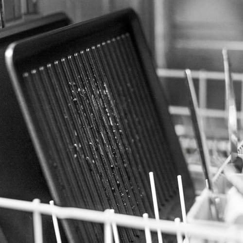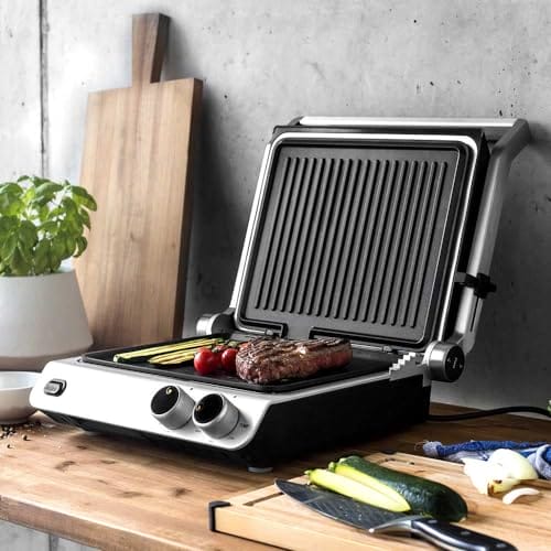 Grill posiada również wiele praktycznych rozwiązań, które ułatwiają jego użytkowanie i czyszczenie. Powierzchnia grillowa jest pokryta warstwą nieprzywierającą, co ułatwia jej czyszczenie, a także jest zmywalna w zmywarce. Dodatkowo, górna płyta grillowa posiada regulację wysokości, co umożliwia dostosowanie jej do grubości potraw.