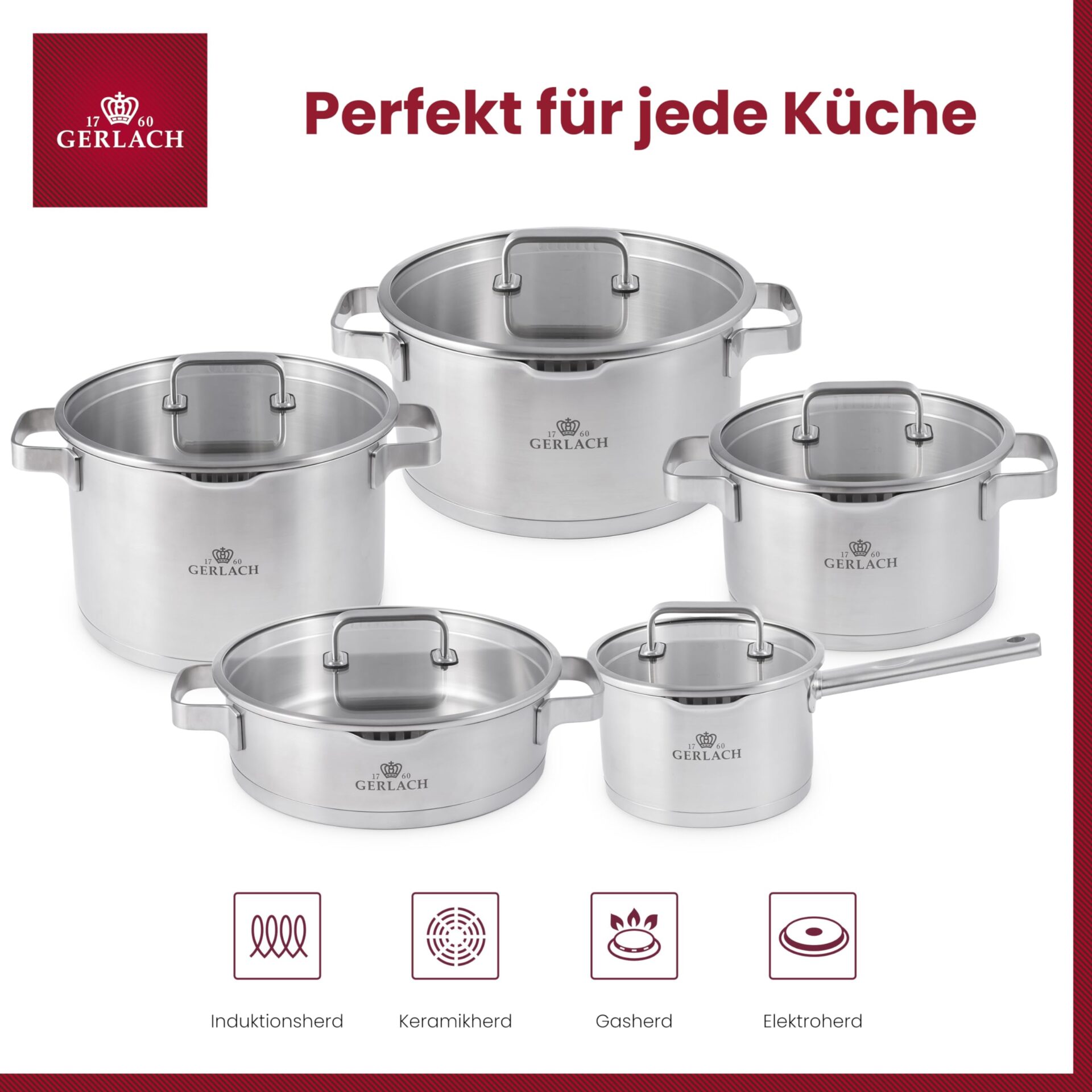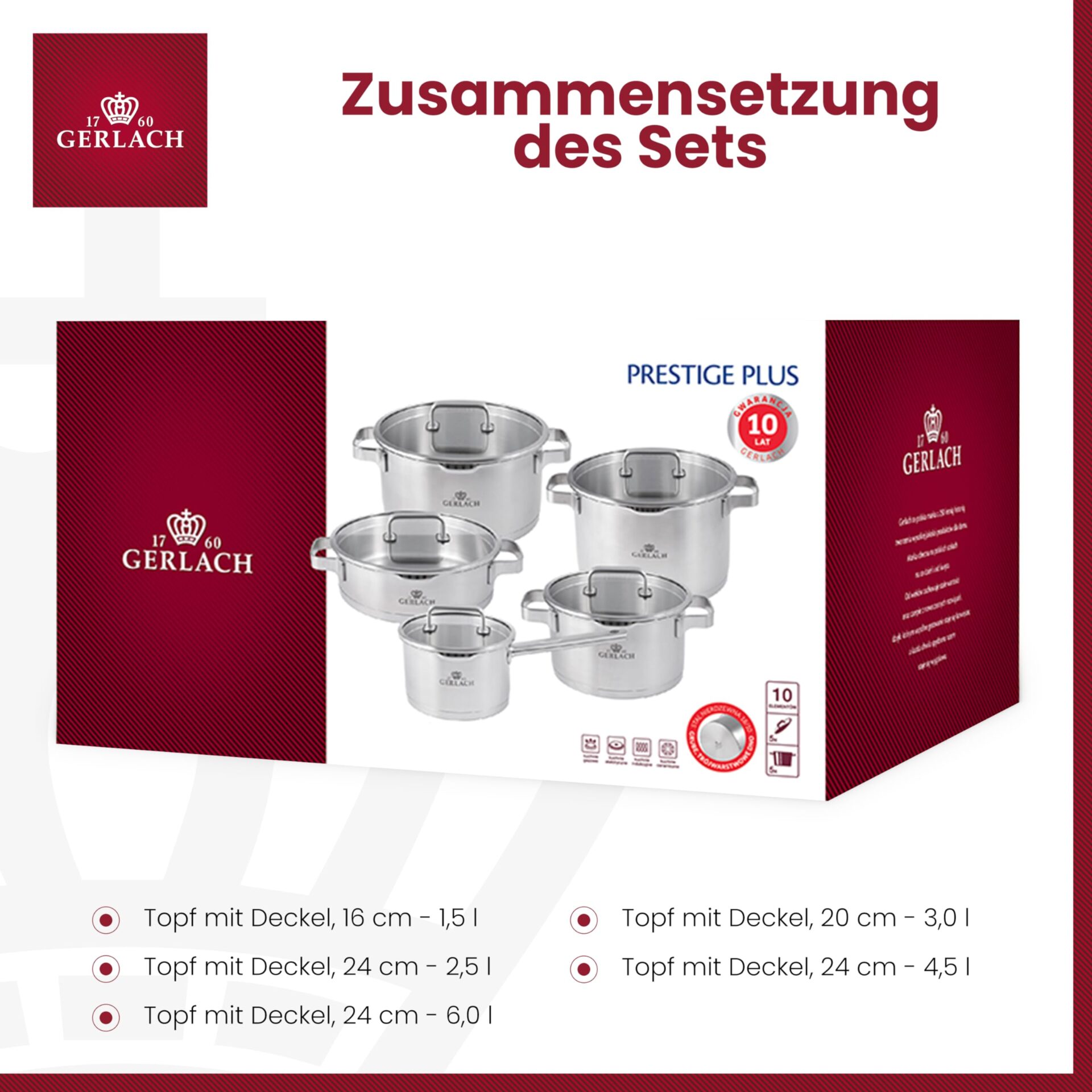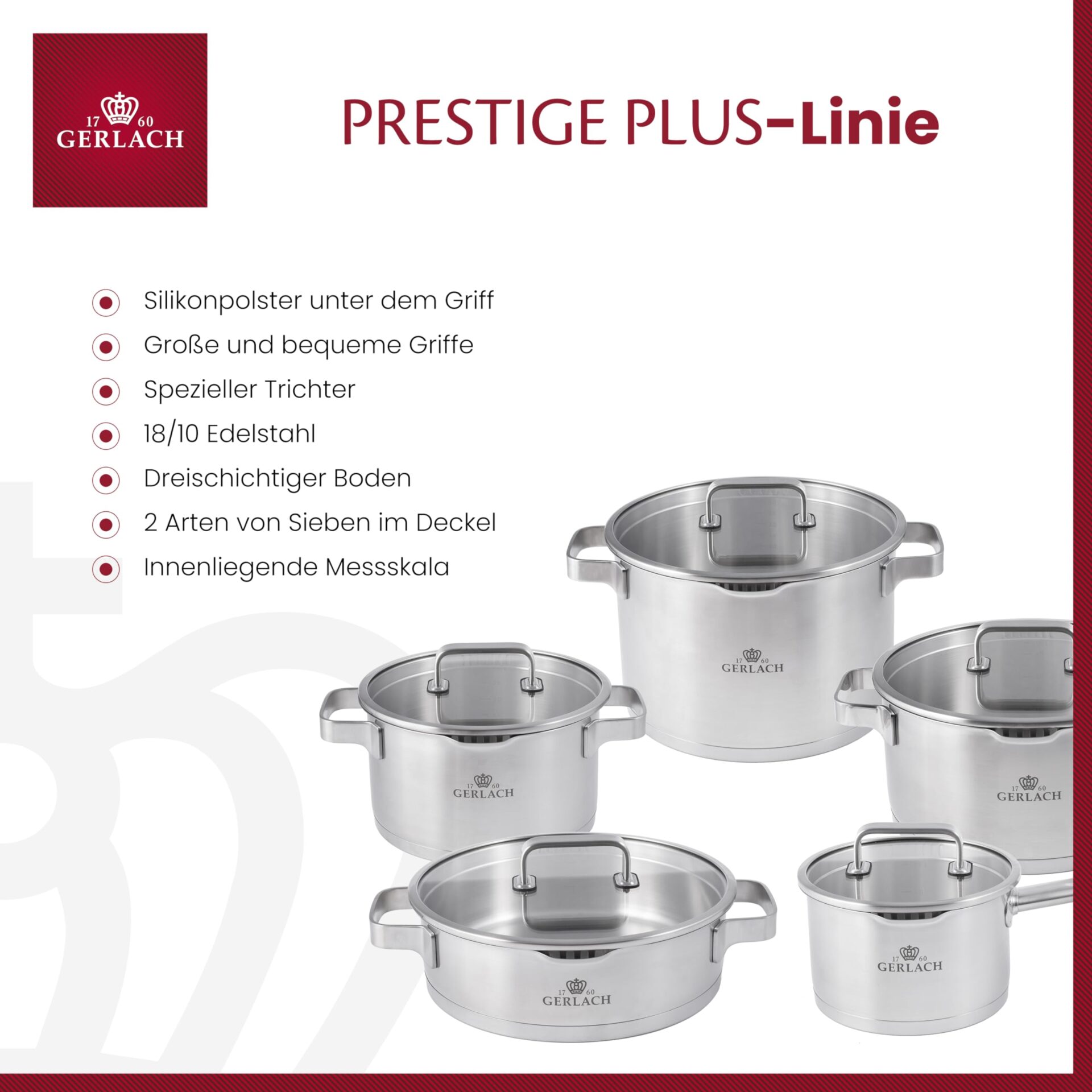Gerlach Prestige Plus Zestaw Garnków Srebrny 10 El. to wyjątkowy zestaw garnków, który łączy w sobie elegancję, funkcjonalność oraz nowoczesne technologie. W skład zestawu wchodzi 10 elementów, w tym garnki o różnych pojemnościach, co sprawia, że jest on idealnym rozwiązaniem zarówno dla małych, jak i dużych rodzin.