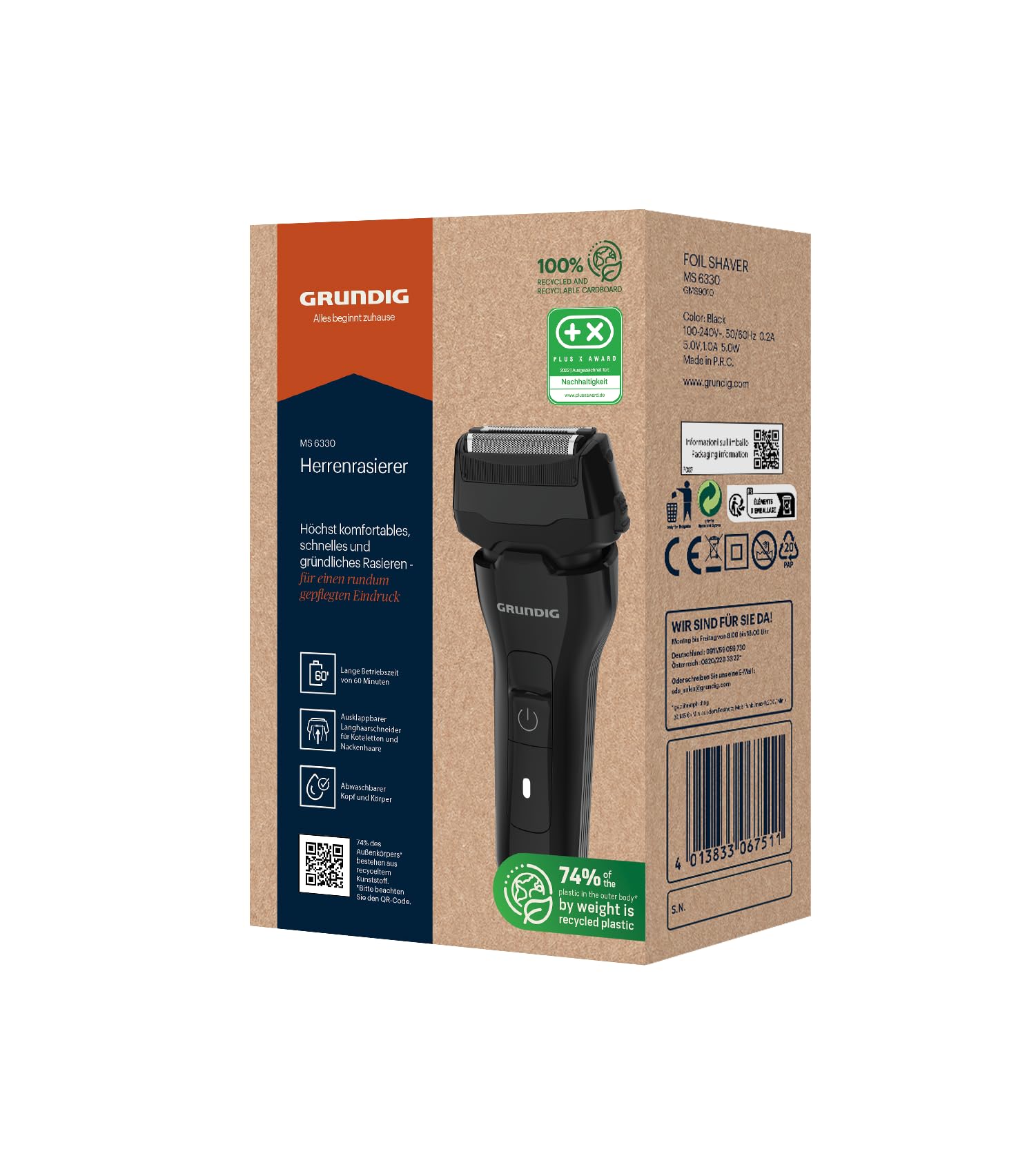 GRUNDIG MS 6330 męska golarka, czas pracy 60 min, rozkładana maszynka do długich włosów, potrójny system cięcia, obudowa z 74% tworzywa sztucznego pochodzącego z recyklingu, zastosowanie na całym