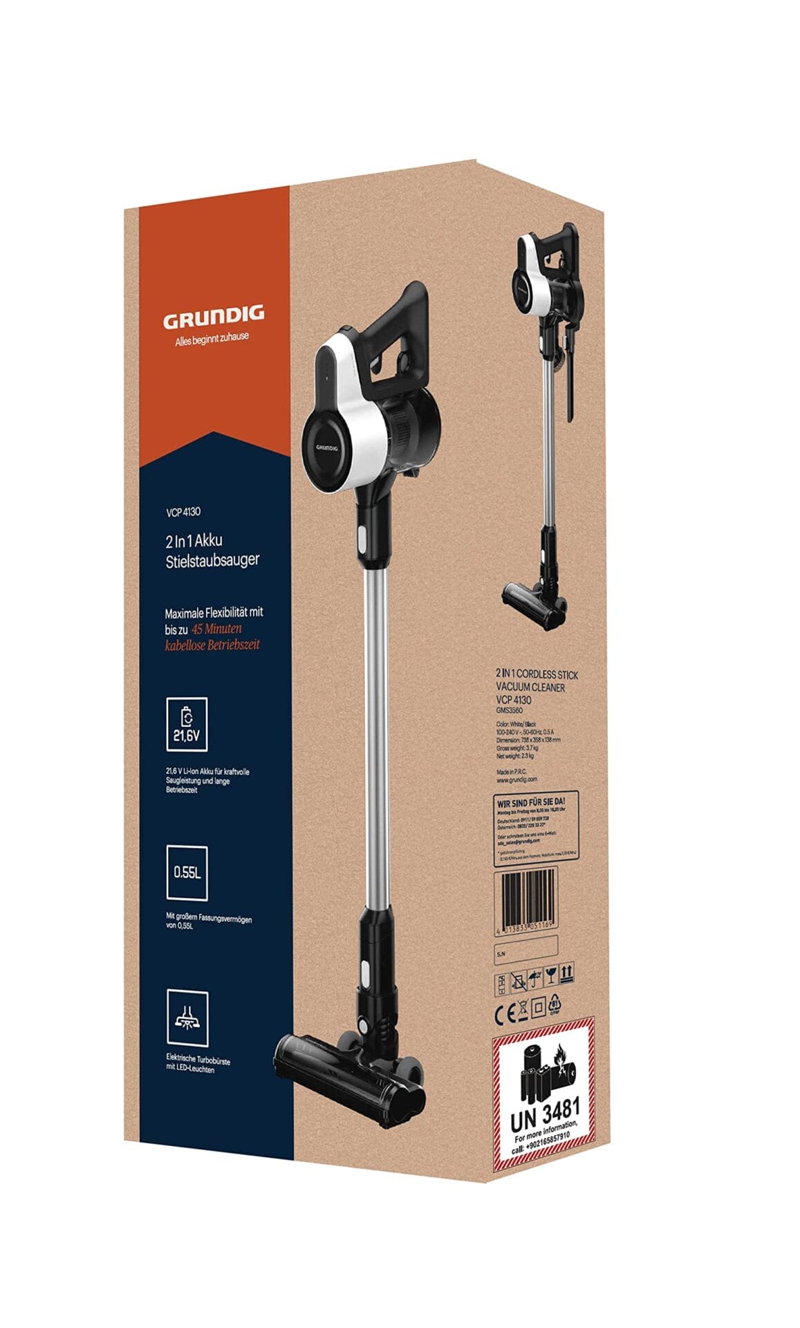 GRUNDIG VCP 4130 odkurzacz akumulatorowy 2 w 1, 2 poziomy siły ssania, silnik 110 W, akumulator litowo-jonowy 21, 6 V, pojemność 550 ml, czas pracy do