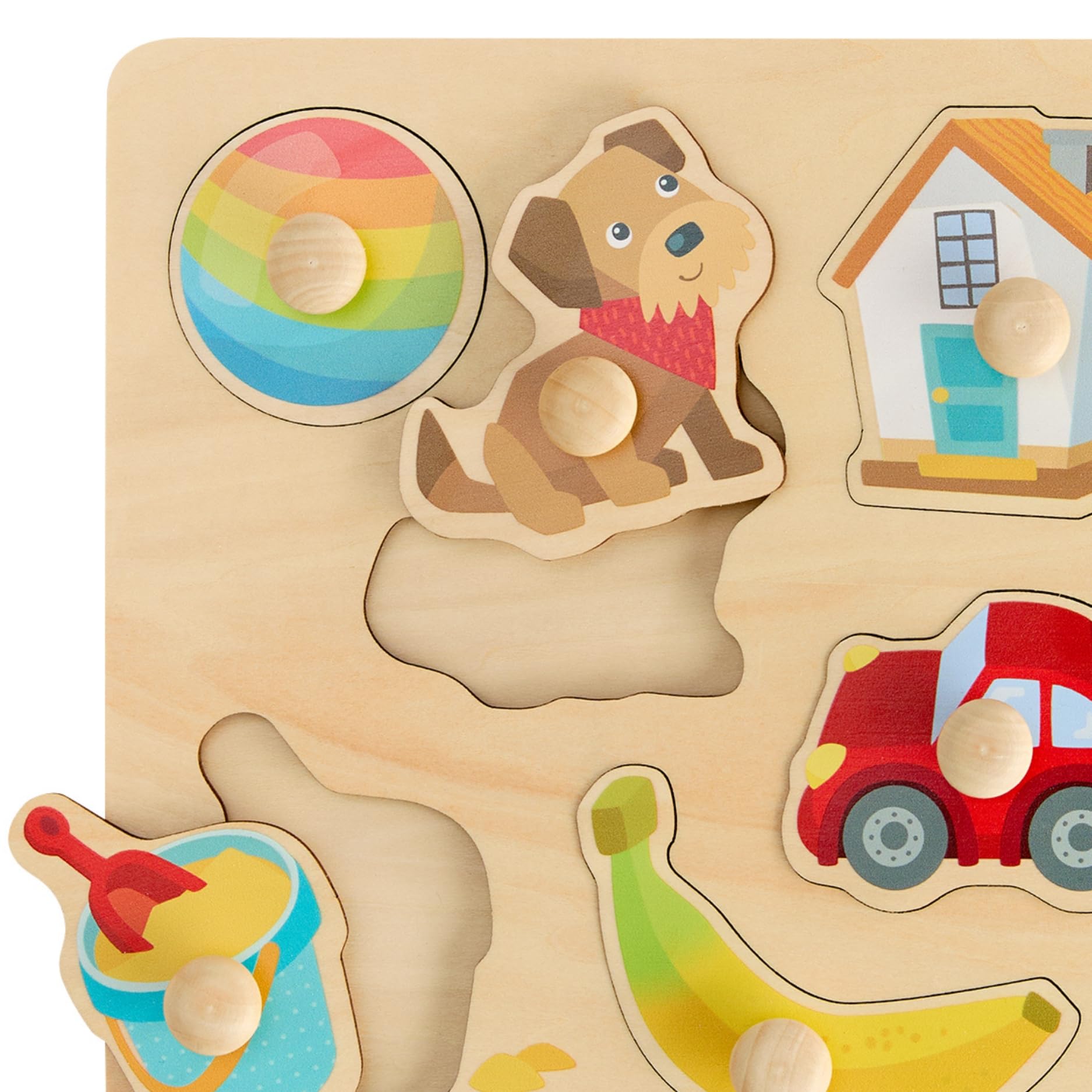 Nauka pierwszych słów:: Nauka pierwszych słów: dzięki tym puzzlom każdy element ma swoje stałe miejsce. Kto rozpoznaje drzewo, dom lub psa i znajdzie odpowiednie wycięcie? Duże drewniane guziki ułatwiają chwytanie i gwarantują szybkie doznania sukcesu.