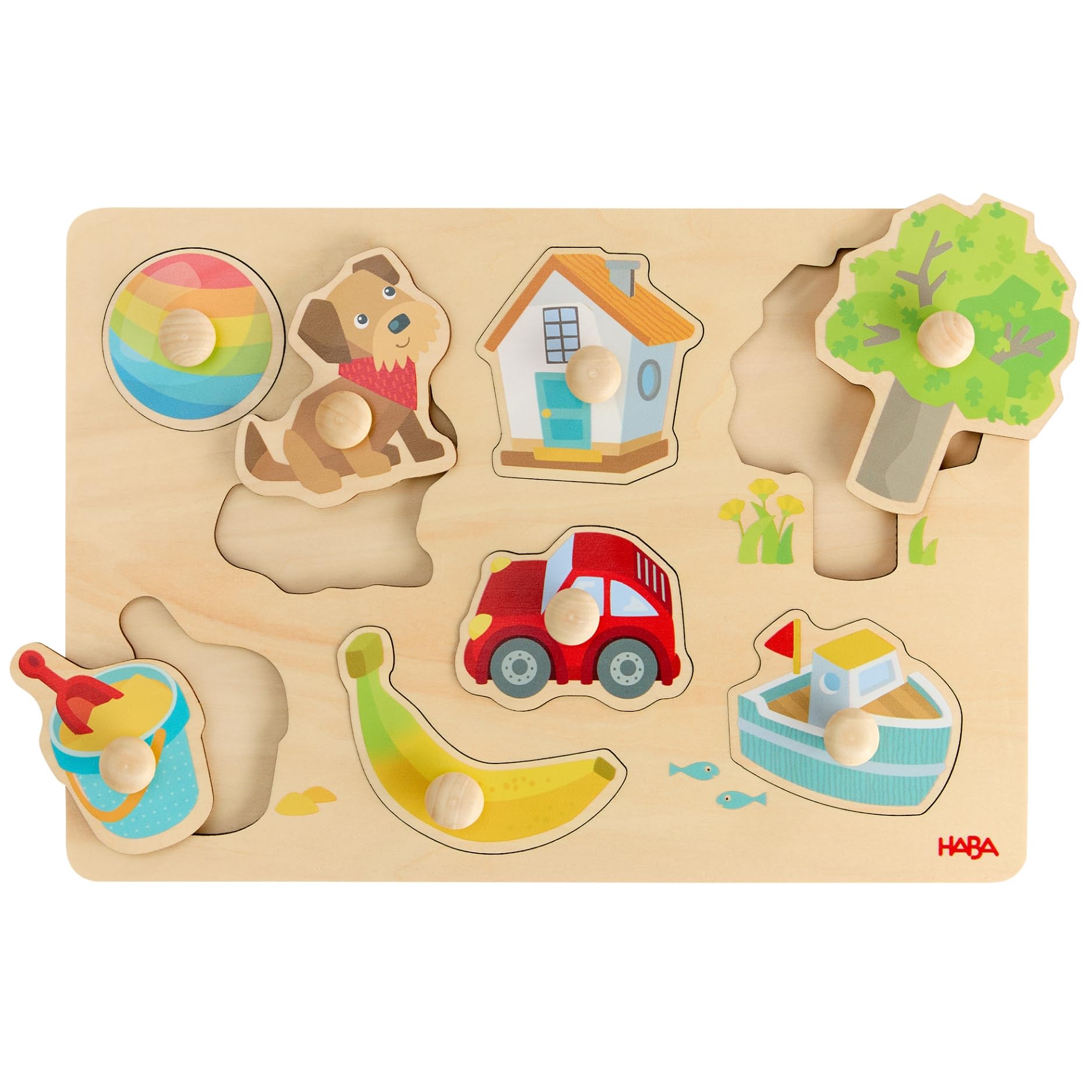HABA Puzzle z chwytakiem pierwsze słowa – drewniane puzzle z dużymi guzikami do nauki pierwszych słów, odkrywanie kolorów i rozpoznawanie kształtów, o