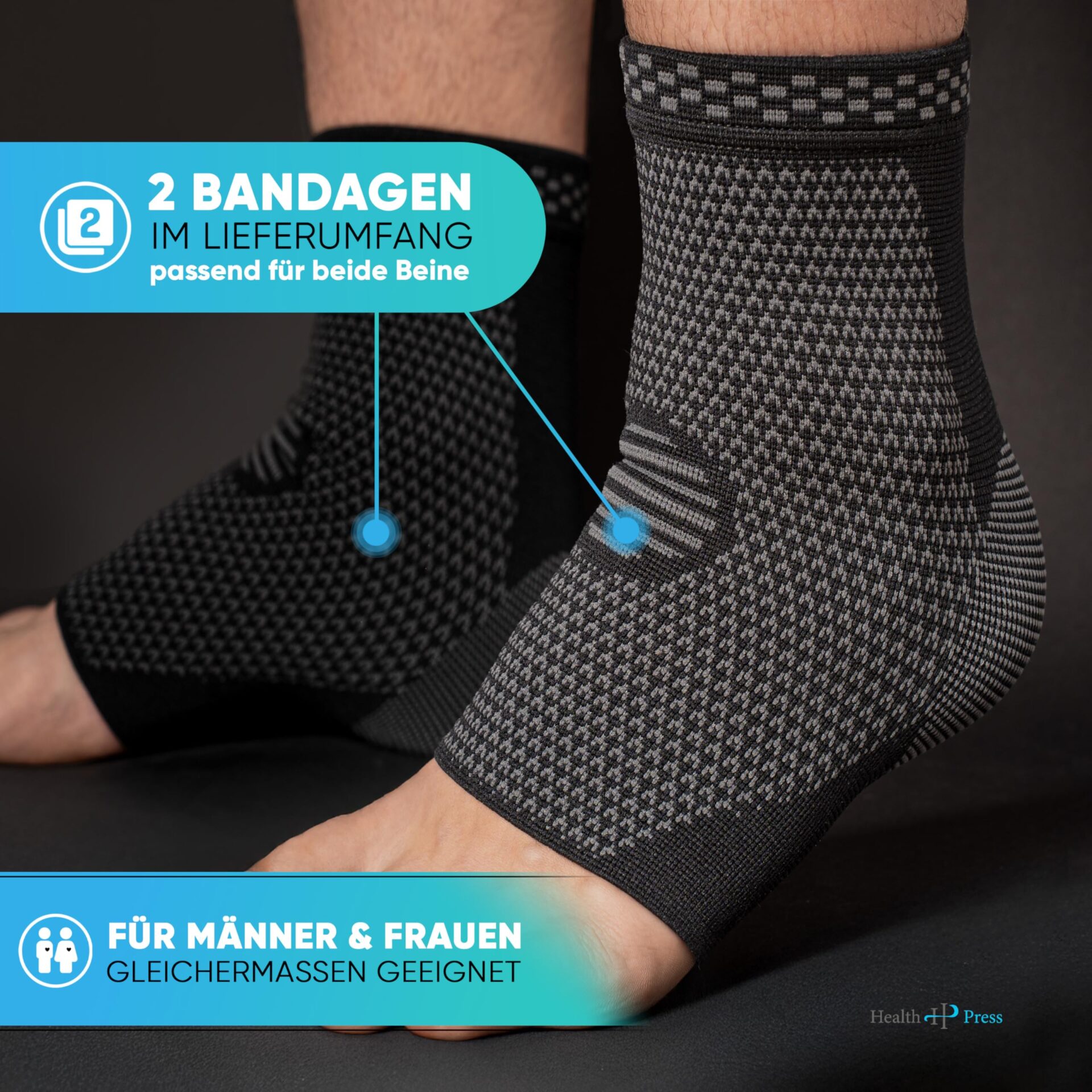 Health Press Bandaż na staw skokowy – profesjonalne pończochy podporowe – odciążenie i stabilizacja stawu skokowego – 2 x bandaż na stopę, rozmiar L – produkt medyczny – bandaż wspomagający kostki