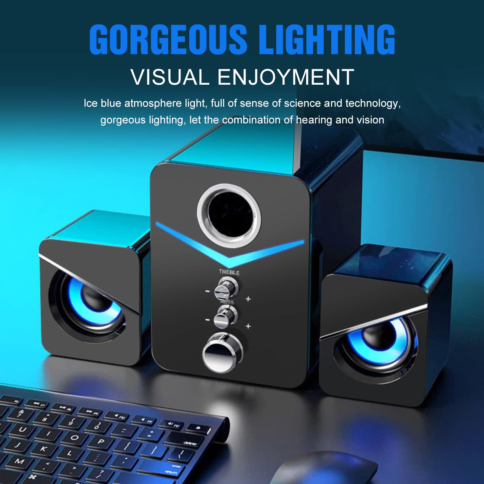 HEANTTV Głośnik komputerowy z subwooferem 2.1 to doskonałe rozwiązanie dla miłośników dźwięku o wysokiej jakości. Ten głośnik komputerowy jest zasilany przez port USB i złącze AUX 3.5 mm, co sprawia, że jest kompatybilny z różnymi urządzeniami, takimi jak komputery stacjonarne, laptopy i tablety.