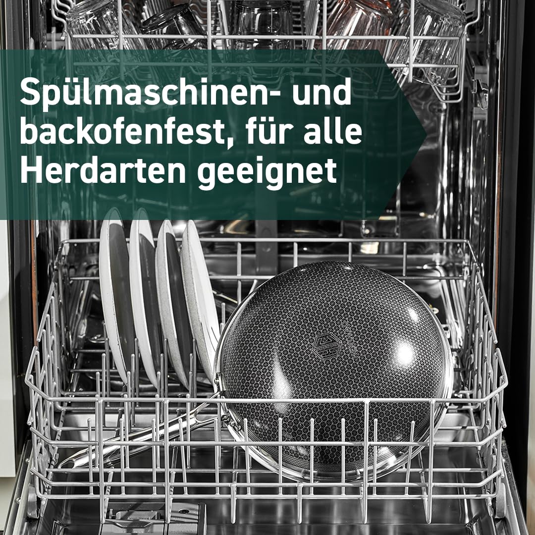 ✅ Tri-ply construction with: Tri-ply construction with an aluminum core for quicker even heating, it’s safe to use on any home cooktop or stovetop, including induction. HexClad is metal utensil-safe, dishwasher-friendly, and oven-safe up to 480°C. (Tempered glass lids are oven-safe up to 200°C, while stainless steel lids are ov