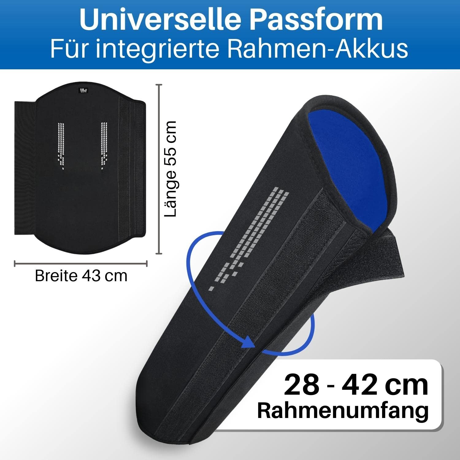 Pokrowiec został wykonany z wysokiej jakości neoprenu, który zapewnia doskonałą ochronę przed warunkami atmosferycznymi. Dzięki elastycznej konstrukcji, pokrowiec łatwo dopasowuje się do akumulatorów o obwodzie od 28 do 42 cm, co sprawia, że jest uniwersalny i pasuje do większości modeli rowerów elektrycznych dostępnych na rynku.