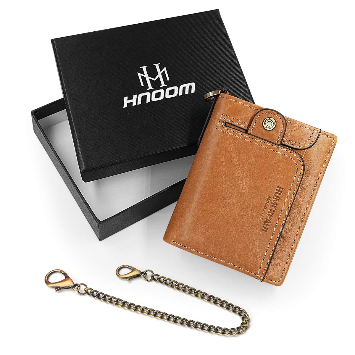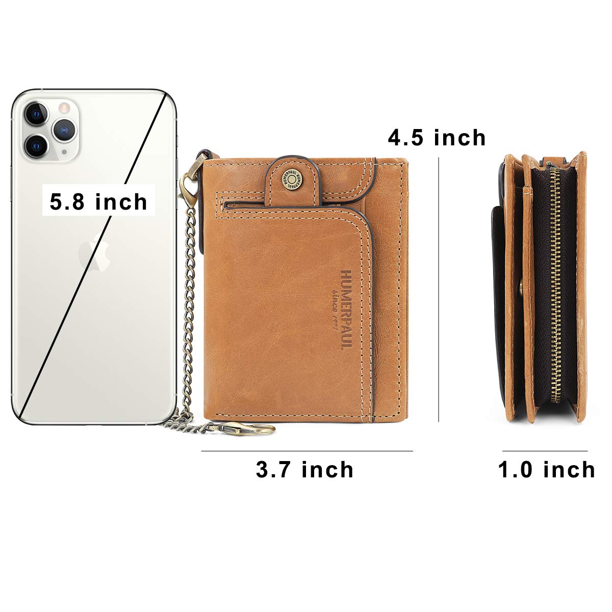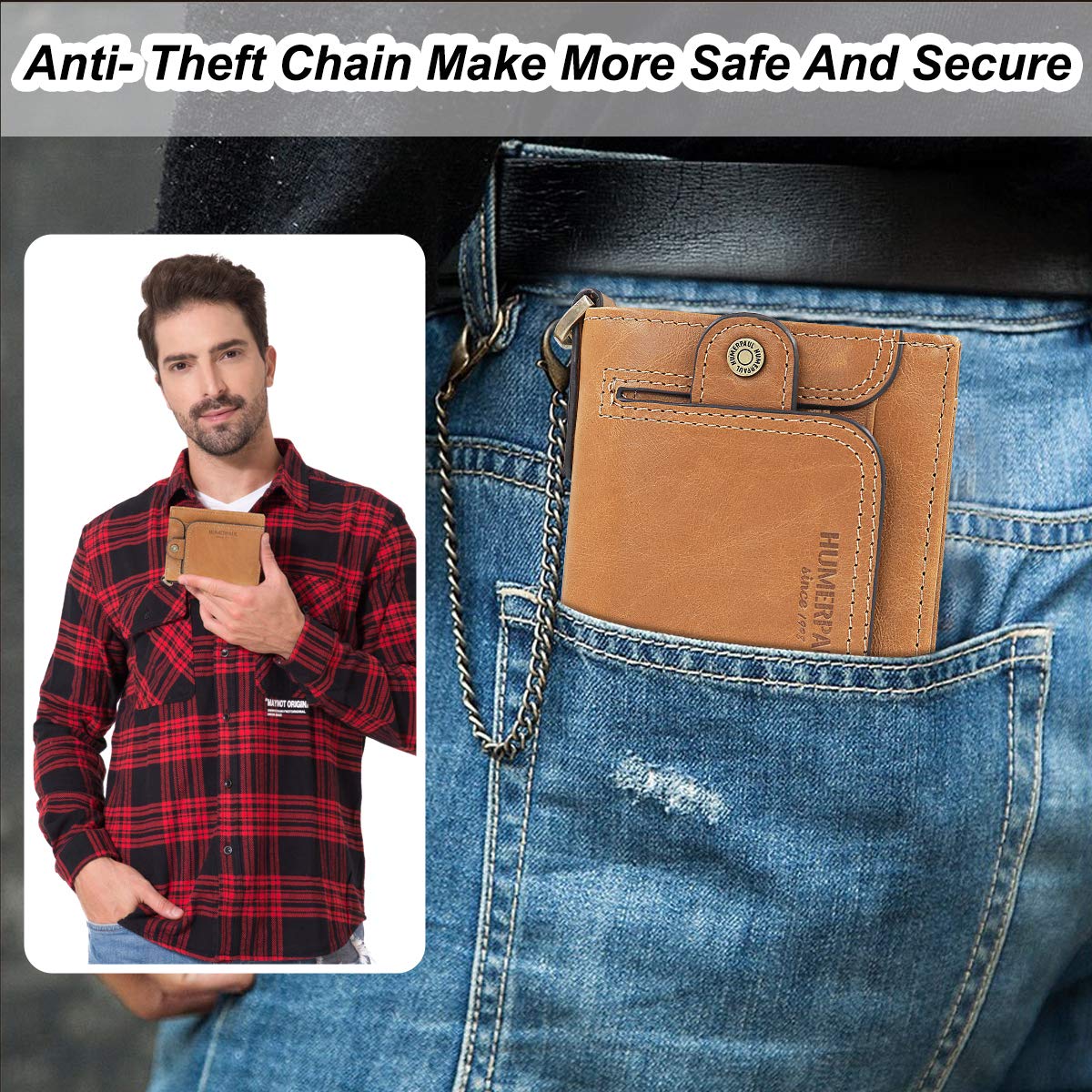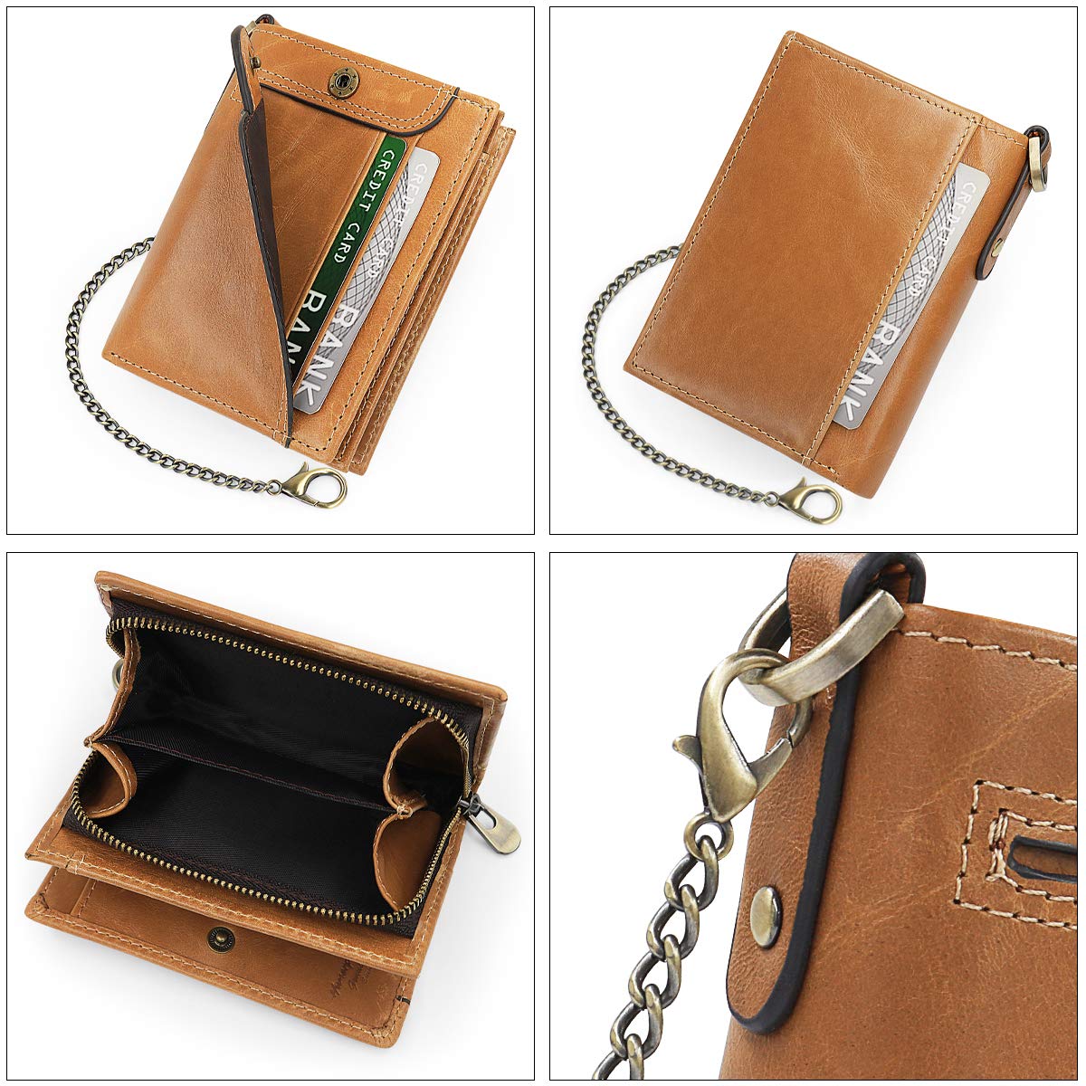 Męski portfel z blokadą RFID z prawdziwej skóry, łańcuszkiem, podwójnie składany, wąski, 14 kieszeni na karty i kieszeń na monety, na zamek błyskawiczny, z pudełkiem prezentowym, Brązowy, S, Vintage