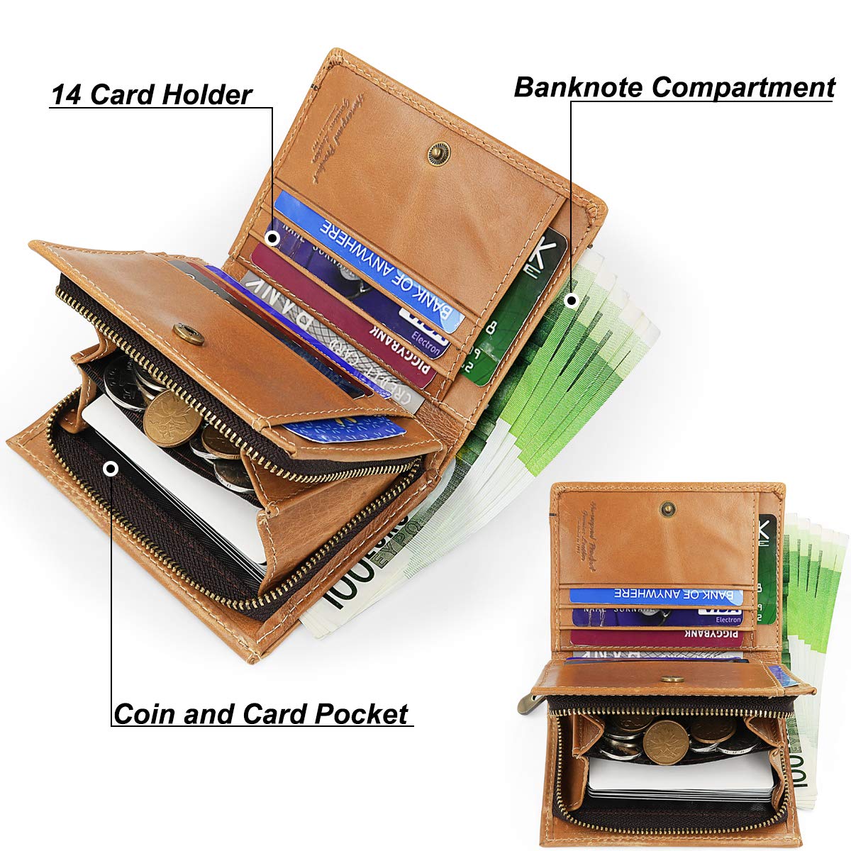 Duża pojemność: męski: Duża pojemność: męski portfel skórzany ma 14 kieszonek na karty ( z blokadą RFID po zamknięciu portfela), 1 kieszeń na banknoty, 1 kieszeń na monety i karty zamykaną na zamek błyskawiczny. Zewnętrzna kieszeń portfela umożliwia łatwe wyjmowanie często używanych kart. Kieszenie na zamek błyskawiczny i